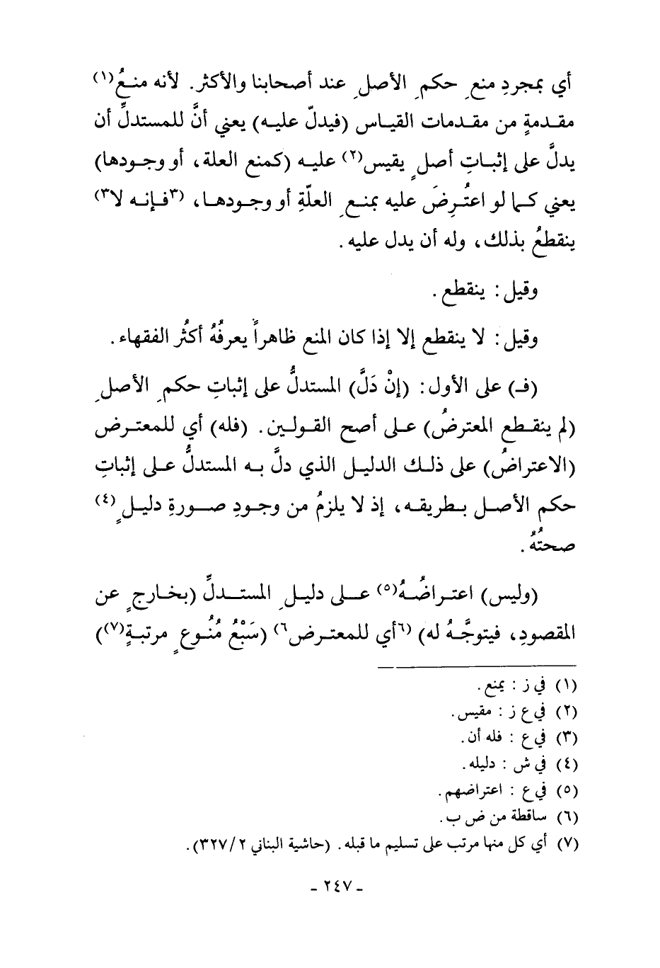 "وَلَيْسَ" اعْتِرَاضُهُ5 عَلَى دَلِيلِ الْمُسْتَدِلِّ "بِخَارِجٍ عَنْ الْمَقْصُودِ، فَيَتَوَجَّهُ لَهُ" أَيْ لِلْمُعْتَرِضِ6 "سَبْعُ مَنُوعٍ مُرَتَّبَةٍ7"