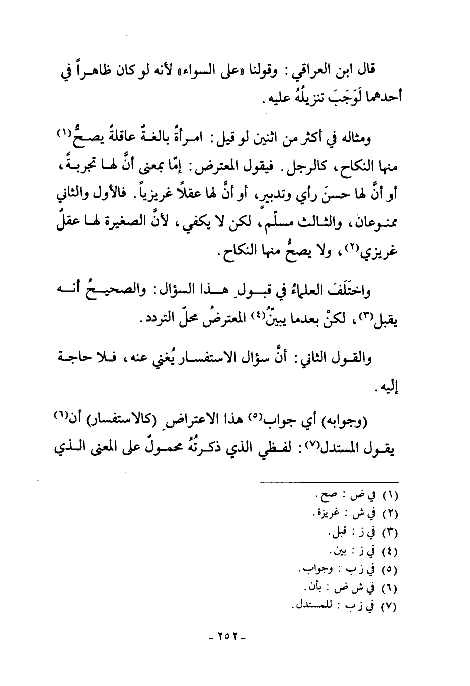 وَاخْتَلَفَ الْعُلَمَاءُ فِي قَبُولِ هَذَا السُّؤَالِ. وَالصَّحِيحُ: أَنَّهُ يُقْبَلُ3، لَكِنْ بَعْدَ مَا يُبَيِّنُ4 الْمُعْتَرِضُ مَحَلَّ التَّرَدُّدِ.