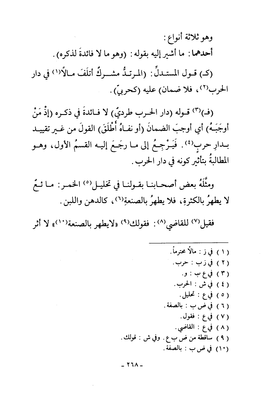 "فَـ 3" قَوْلُهُ "دَارُ الْحَرْبِ: طَرْدِيٌّ" لا فَائِدَةَ فِي ذِكْرِهِ "إذْ مَنْ أَوْجَبَهُ" أَيْ أَوْجَبَ الضَّمَانَ "أَوْ نَفَاهُ: أَطْلَقَ" الْقَوْلَ مِنْ غَيْرِ تَقْيِيدٍ بِدَارِ الْحَرْبِ4. فَيَرْجِعُ إلَى مَا رَجَعَ إلَيْهِ الْقِسْمُ الأَوَّلُ، وَهُوَ الْمُطَالَبَةُ بِتَأْثِيرِ كَوْنِهِ فِي دَارِ الْحَرْبِ.