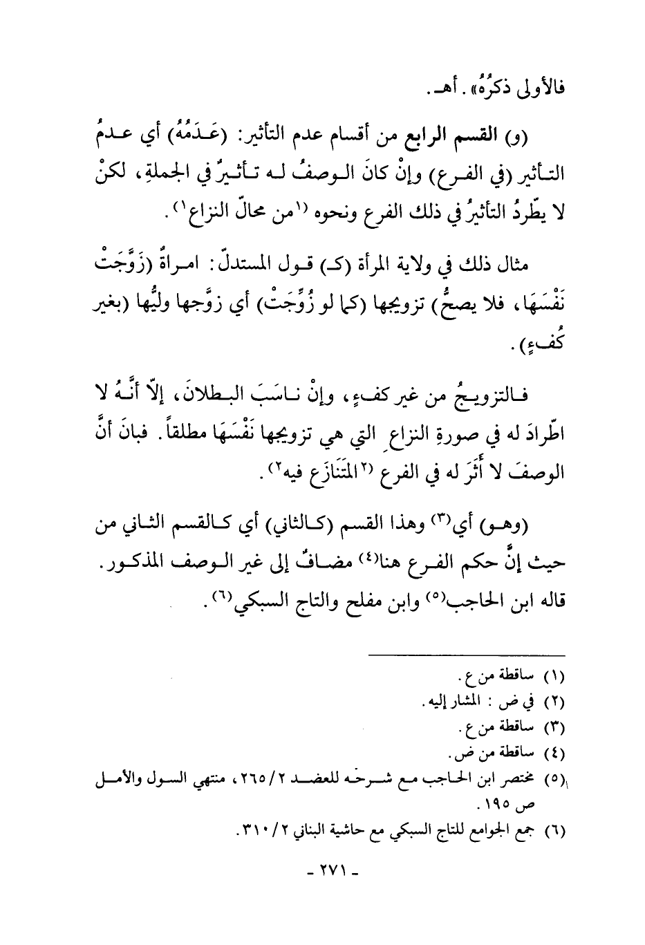 فَالتَّزْوِيجُ مِنْ غَيْرِ كُفْءٍ، وَإِنْ نَاسَبَ الْبُطْلانَ، إلاَّ أَنَّهُ لا اطِّرَادَ لَهُ فِي صُورَةِ النِّزَاعِ الَّتِي هِيَ تَزْوِيجُهَا نَفْسَهَا مُطْلَقًا. فَبَانَ أَنَّ الْوَصْفَ لا أَثَرَ لَهُ فِي الْفَرْعِ الْمُتَنَازَعِ فِيهِ2.