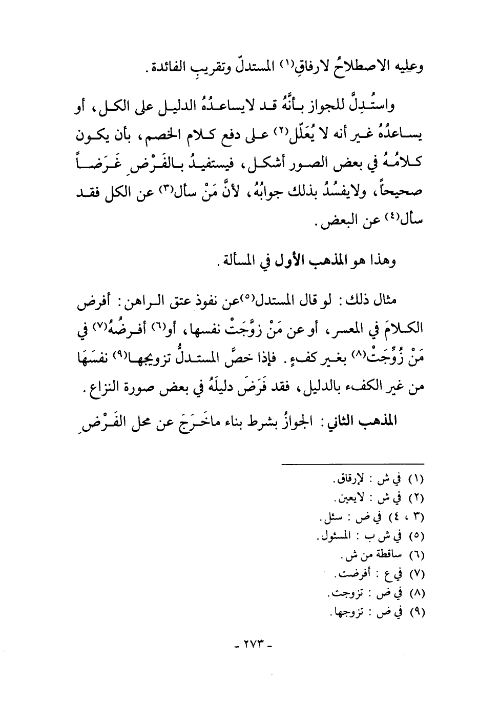 وَاسْتُدِلَّ لِلْجَوَازِ بِأَنَّهُ قَدْ لا يُسَاعِدُهُ الدَّلِيلُ عَلَى الْكُلِّ، أَوْ يُسَاعِدُهُ، غَيْرَ أَنَّهُ لا يُعَلَّلُ2 عَلَى دَفْعِ كَلامِ الْخَصْمِ، بِأَنْ يَكُونَ كَلامُهُ فِي بَعْضِ الصُّوَرِ أَشْكَلَ. فَيَسْتَفِيدُ بِالْفَرْضِ غَرَضًا صَحِيحًا، وَلا يَفْسُدُ بِذَلِكَ جَوَابُهُ؛ لأَنَّ مَنْ سَأَلَ3 عَنْ الْكُلِّ فَقَدْ سَأَلَ4 عَنْ الْبَعْضِ.