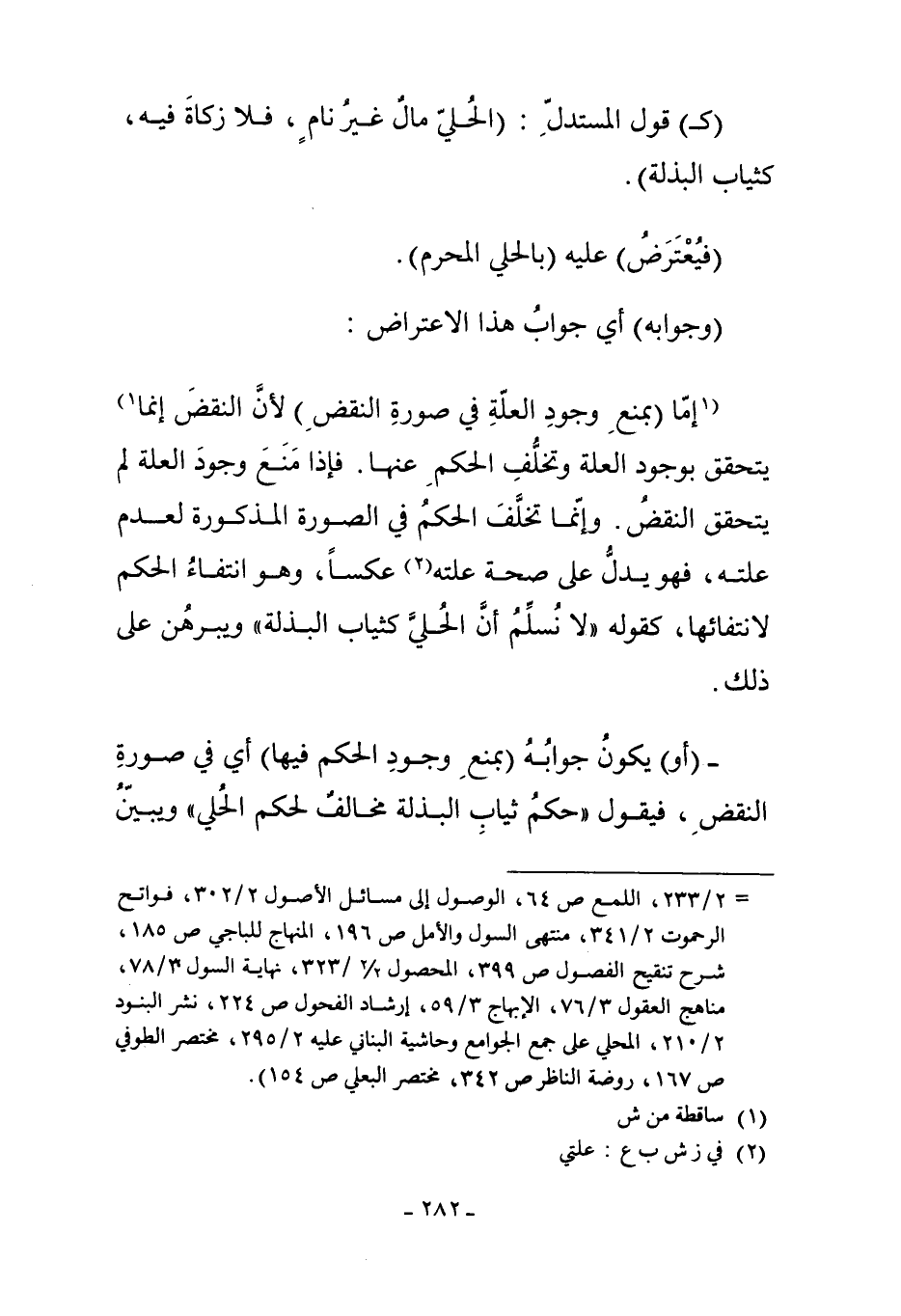إمَّا "بِمَنْعِ وُجُودِ الْعِلَّةِ فِي صُورَةِ النَّقْضِ" لأَنَّ النَّقْضَ إنَّمَا1 يَتَحَقَّقُ بِوُجُودِ الْعِلَّةِ وَتَخَلُّفِ الْحُكْمِ عَنْهَا. فَإِذَا مُنِعَ وُجُودُ الْعِلَّةِ لَمْ يَتَحَقَّقْ النَّقْضُ. وَإِنَّمَا تَخَلَّفَ الْحُكْمُ فِي الصُّورَةِ الْمَذْكُورَةِ لِعَدَمِ عِلَّتِهِ، فَهُوَ يَدُلُّ عَلَى صِحَّةِ عِلَّتِهِ عَكْسًا2، وَهُوَ انْتِفَاءُ الْحُكْمِ لانْتِفَائِهَا، كَقَوْلِهِ: لا نُسَلِّمُ أَنَّ الْحُلِيَّ كَثِيَابِ الْبِذْلَةِ. وَيُبَرْهِنُ عَلَى ذَلِكَ.
