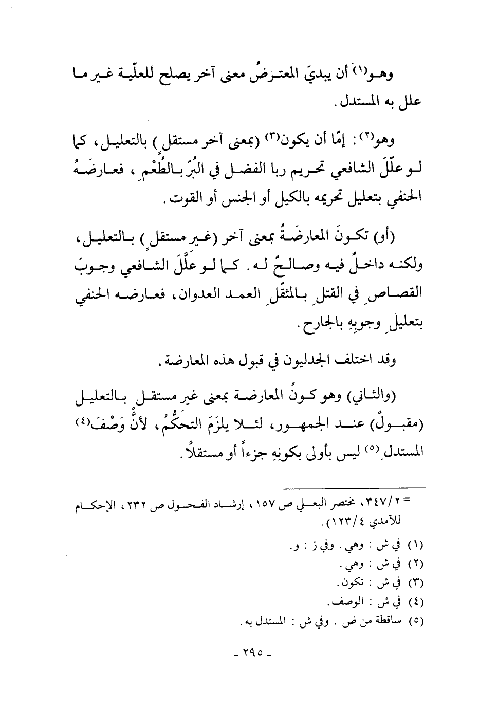 "أَوْ" تَكُونُ الْمُعَارَضَةُ بِمَعْنًى آخَرَ "غَيْرِ مُسْتَقِلٍّ" بِالتَّعْلِيلِ. وَلَكِنَّهُ دَاخِلٌ فِيهِ وَصَالِحٌ لَهُ كَمَا لَوْ عَلَّلَ الشَّافِعِيُّ وُجُوبَ الْقِصَاصِ فِي الْقَتْلِ بِالْمُثَقَّلِ الْعَمْدِ الْعُدْوَانِ. فَعَارَضَهُ الْحَنَفِيُّ بِتَعْلِيلِ وُجُوبِهِ بِالْجَارِحِ.
