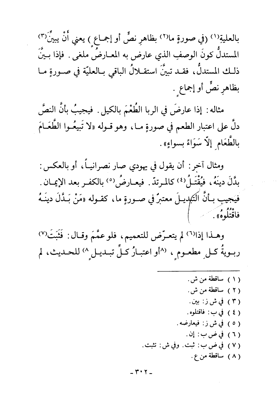 وَمِثَالٌ آخَرُ: أَنْ يَقُولَ فِي يَهُودِيٍّ صَارَ نَصْرَانِيًّا أَوْ بِالْعَكْسِ: بَدَّلَ دِينَهُ. فَيُقْتَلُ4 كَالْمُرْتَدِّ، فَيُعَارِضُ5 بِالْكُفْرِ بَعْدَ الإِيمَانِ. فَيُجِيبُ بِأَنَّ التَّبْدِيلَ مُعْتَبَرٌ فِي صُورَةٍ مَا، كَقَوْلِهِ "مَنْ بَدَّلَ دِينَهُ فَاقْتُلُوهُ".