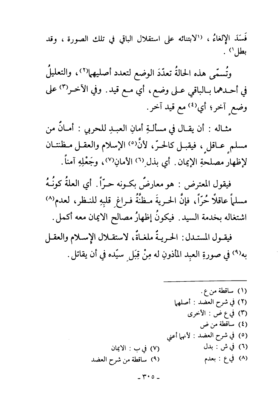 فَيَقُولُ الْمُعْتَرِضُ: هُوَ مُعَارَضٌ بِكَوْنِهِ حُرًّا، أَيْ الْعِلَّةُ كَوْنُهُ مُسْلِمًا عَاقِلاً حُرًّا. فَإِنَّ الْحُرِّيَّةَ مَظِنَّةُ فَرَاغِ قَلْبِهِ لِلنَّظَرِ لِعَدَمِ8 اشْتِغَالِهِ بِخِدْمَةِ السَّيِّدِ فَيَكُونُ إظْهَارُ مَصَالِحِ الإِيمَانِ مَعَهُ أَكْمَلَ.