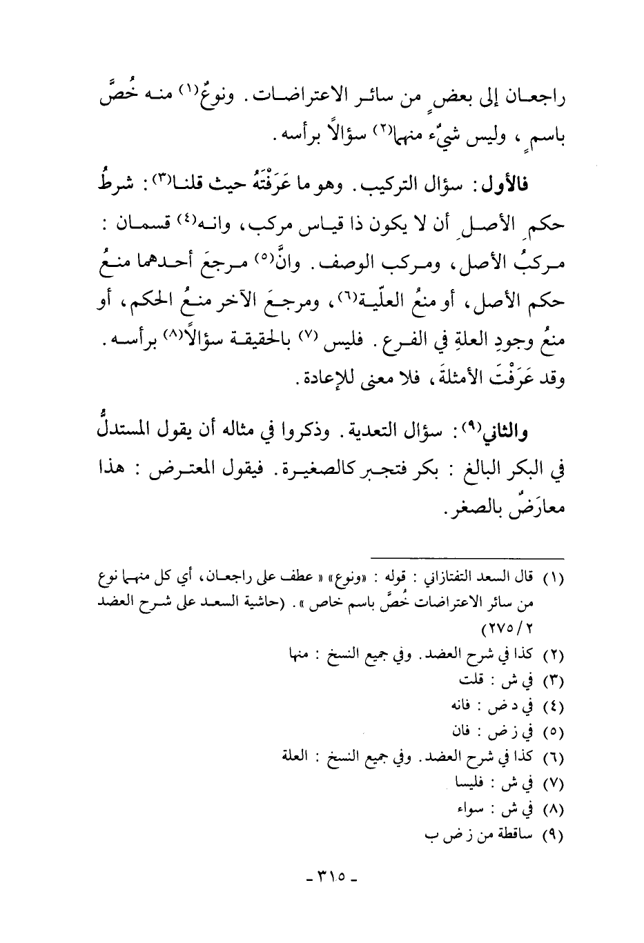 1 قال السعد التفتازاني: قوله: "ونوع" "عطف على راجعان، أي كل منهما نوع من سائر الاعتراضات خُصَّ باسم خاص". "حاشية السعد على شرح العضد 2/275".