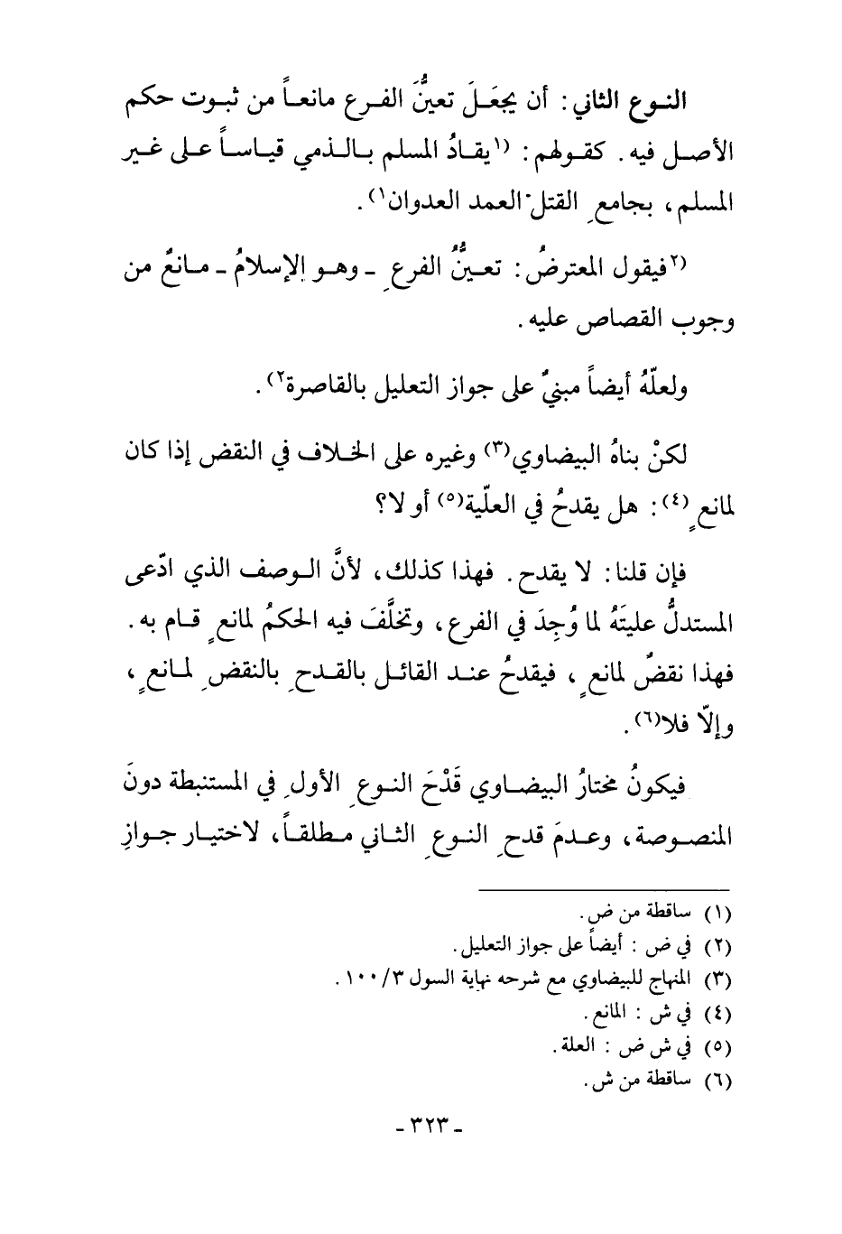 لَكِنْ بَنَاهُ الْبَيْضَاوِيُّ 3 وَغَيْرُهُ عَلَى الْخِلافِ فِي النَّقْضِ إذَا كَانَ لِمَانِعٍ4: هَلْ يَقْدَحُ فِي الْعِلِّيَّةِ5 أَوْ لا؟