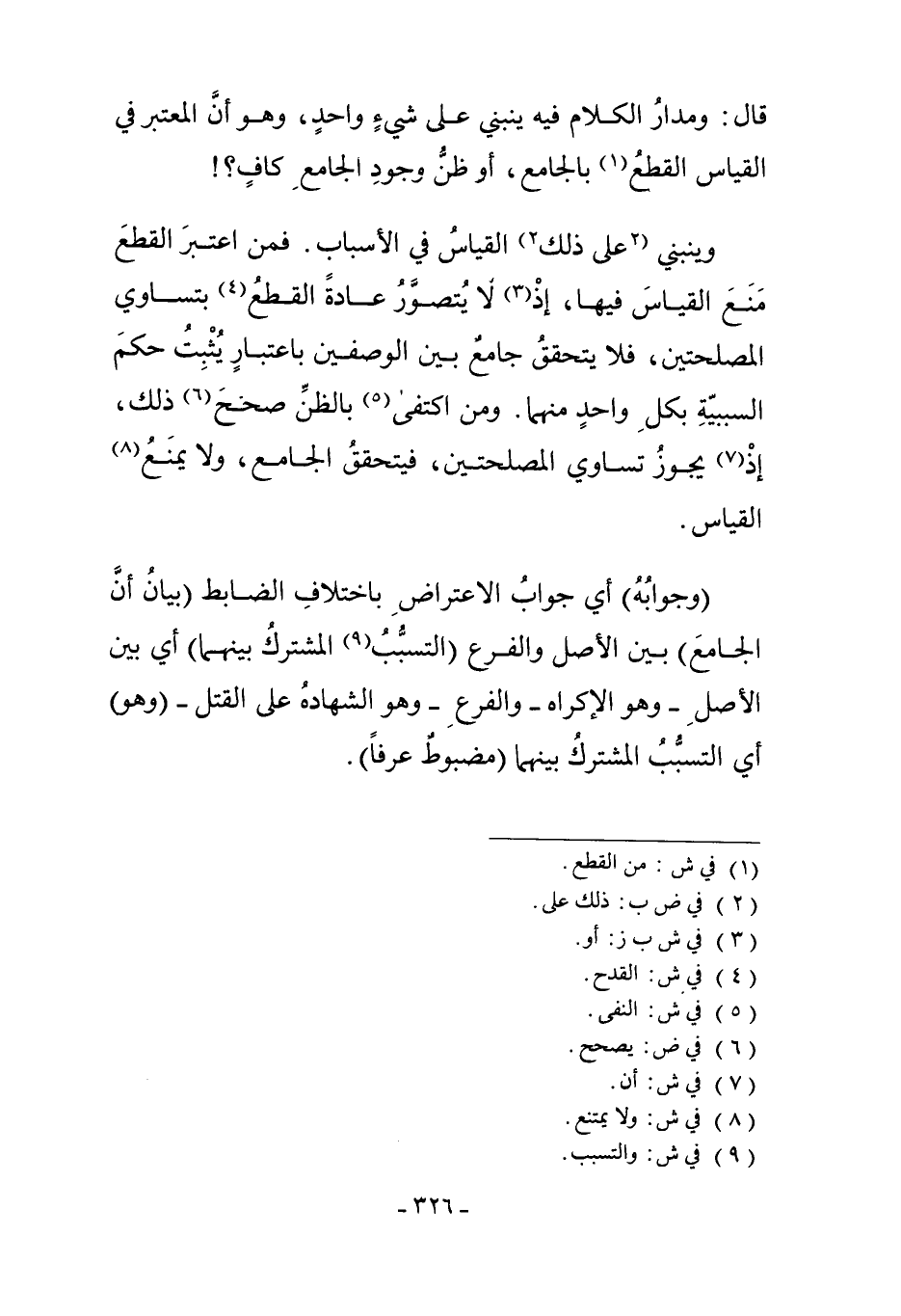 قَالَ: وَمَدَارُ الْكَلامِ فِيهِ يَنْبَنِي عَلَى شَيْءٍ وَاحِدٍ، وَهُوَ أَنَّ الْمُعْتَبَرَ فِي الْقِيَاسِ الْقَطْعُ1 بِالْجَامِعِ أَوْ ظَنُّ وُجُودِ الْجَامِعِ كَافٍ.
