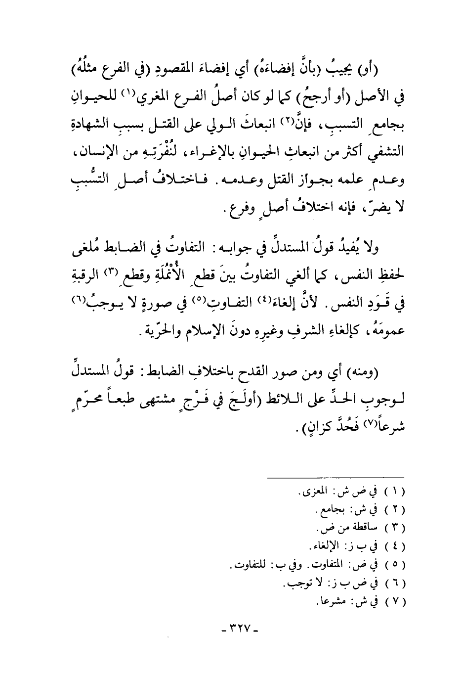 "أَوْ" يُجِيبُ "بِأَنَّ إفْضَاءَهُ" أَيْ إفْضَاءَ الْمَقْصُودِ "فِي الْفَرْعِ مِثْلُهُ" فِي الأَصْلِ "أَوْ أَرْجَحُ" كَمَا لَوْ كَانَ أَصْلُ الْفَرْعِ الْمُغْرِي1 لِلْحَيَوَانِ بِجَامِعِ التَّسَبُّبِ فَإِنَّ2 انْبِعَاثَ الْوَلِيِّ عَلَى الْقَتْلِ بِسَبَبِ الشَّهَادَةِ التَّشَفِّي أَكْثَرُ مِنْ انْبِعَاثِ الْحَيَوَانِ بِالإِغْرَاءِ لِنُفْرَتِهِ مِنْ الإِنْسَانِ، وَعَدَمِ عِلْمِهِ بِجَوَازِ الْقَتْلِ وَعَدَمِهِ. فَاخْتِلافُ أَصْلِ التَّسَبُّبِ لا يَضُرُّ، فَإِنَّهُ اخْتِلافُ أَصْلٍ وَفَرْعٍ.