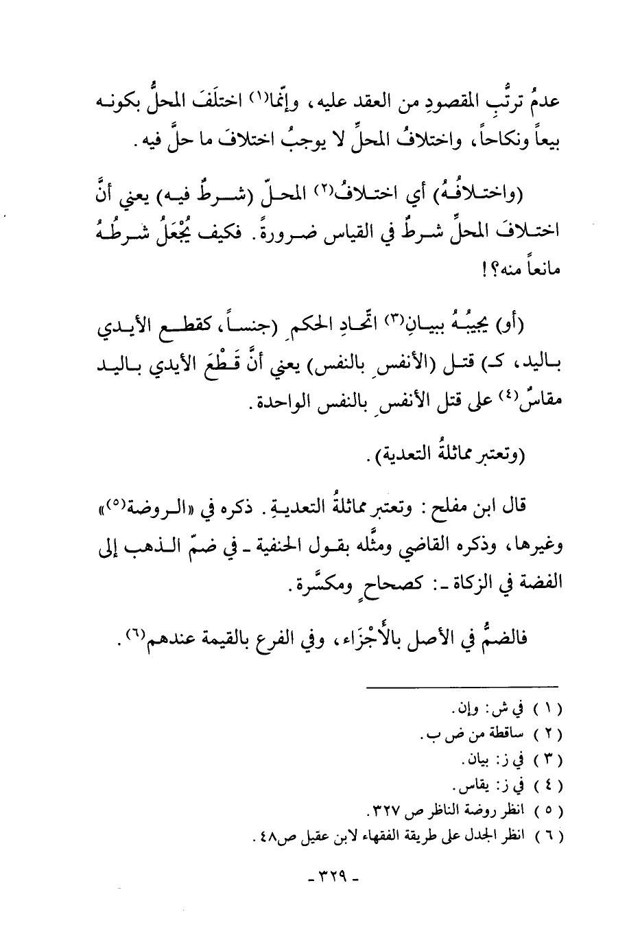 قَالَ ابْنُ مُفْلِحٍ: وَتُعْتَبَرُ مُمَاثَلَةُ التَّعْدِيَةِ، ذَكَرَهُ فِي الرَّوْضَةِ5 وَغَيْرِهَا. وَذَكَرَهُ الْقَاضِي وَمَثَّلَهُ بِقَوْلِ الْحَنَفِيَّةِ فِي ضَمِّ الذَّهَبِ إلَى الْفِضَّةِ فِي الزَّكَاةِ: كَصِحَاحٍ وَمُكَسَّرَةٍ.