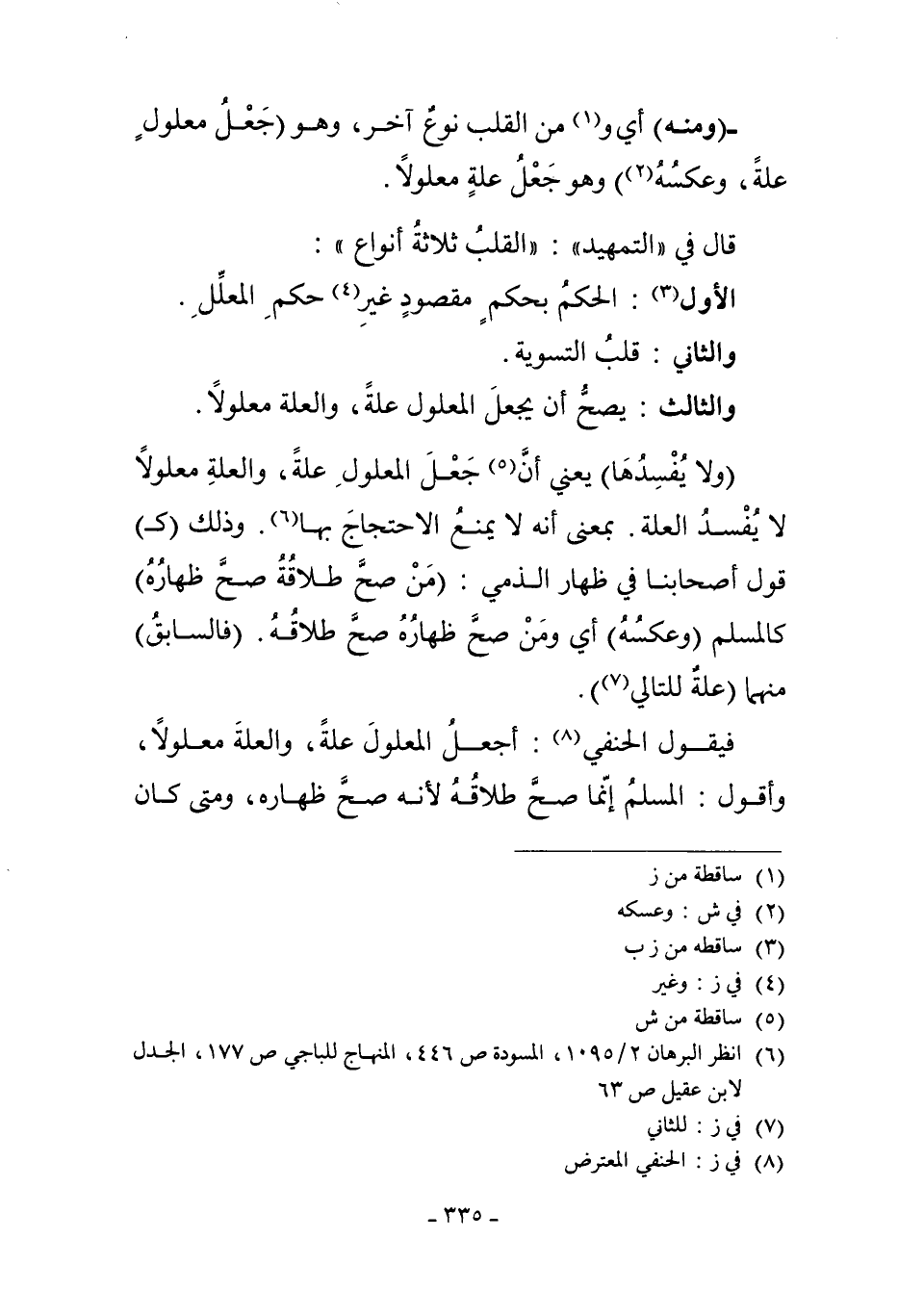 - "وَمِنْهُ" أَيْ وَ1مِنْ الْقَلْبِ نَوْعٌ آخَرُ، وَهُوَ "جَعْلُ مَعْلُولٍ عِلَّةً وَعَكْسُهُ 2" وَهُوَ جَعْلُ عِلَّةٍ مَعْلُولاً.