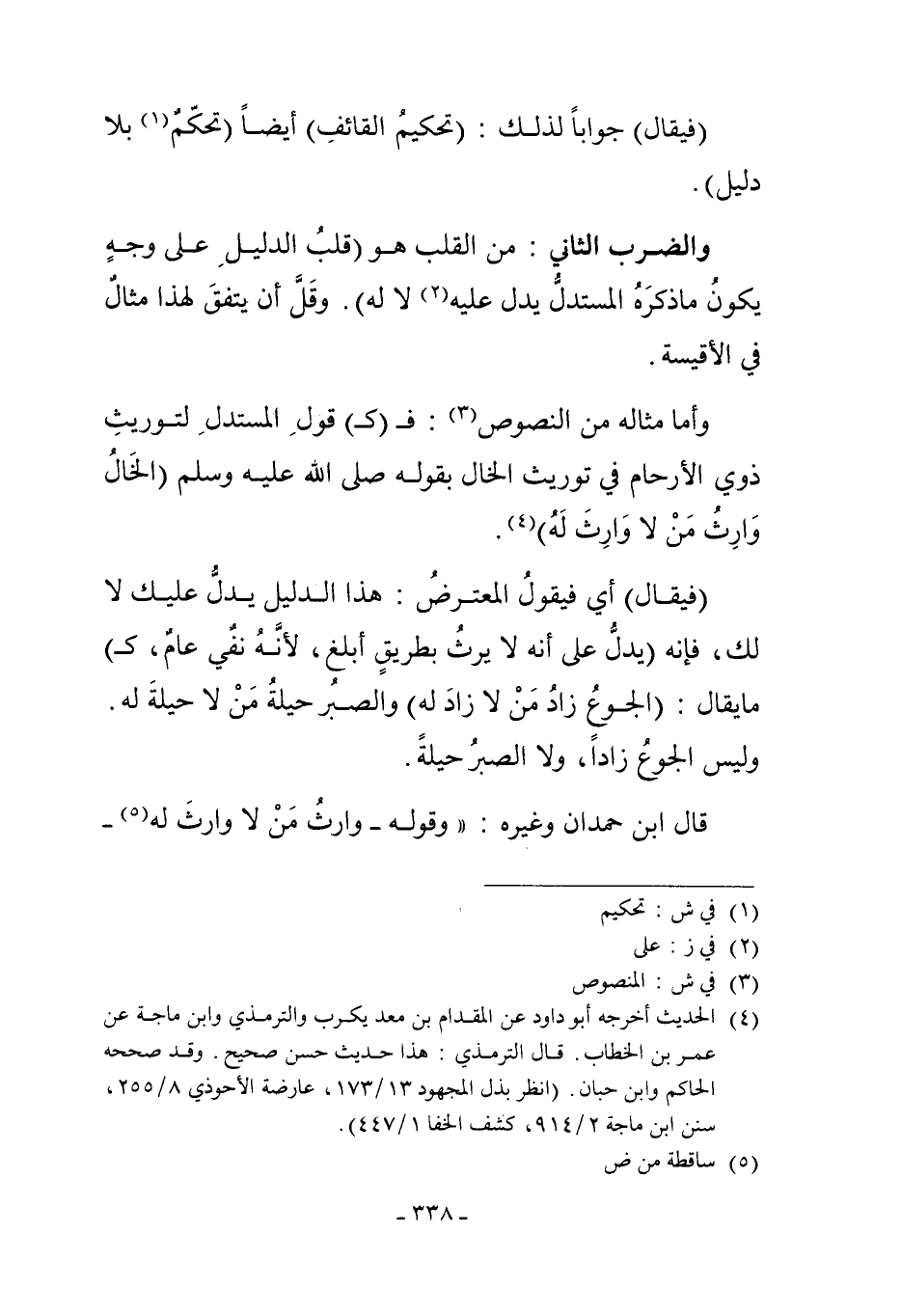 وَأَمَّا مِثَالُهُ مِنْ الْمَنْصُوصِ3 فَـ "كَـ" قَوْلِ الْمُسْتَدِلِّ لِتَوْرِيثِ ذَوِي الأَرْحَامِ فِي تَوْرِيثِ الْخَالِ بِقَوْلِهِ صَلَّى اللَّهُ عَلَيْهِ وَسَلَّمَ "الْخَالُ وَارِثُ مَنْ لا وَارِثَ لَهُ" 4 فَيُقَالُ" أَيْ فَيَقُولُ الْمُعْتَرِضُ: هَذَا الدَّلِيلُ يَدُلُّ عَلَيْك لا لَك. فَإِنَّهُ "يَدُلُّ عَلَى أَنَّهُ لا يَرِثُ بِطَرِيقٍ أَبْلَغَ؛ لأَنَّهُ نَفْيٌ عَامٌّ، كَ" مَا يُقَالُ "الْجُوعُ زَادُ مَنْ لا زَادَ لَهُ" وَالصَّبْرُ حِيلَةُ مَنْ لا حِيلَةَ لَهُ، وَلَيْسَ الْجُوعُ زَادًا، وَلا الصَّبْرُ حِيلَةً.