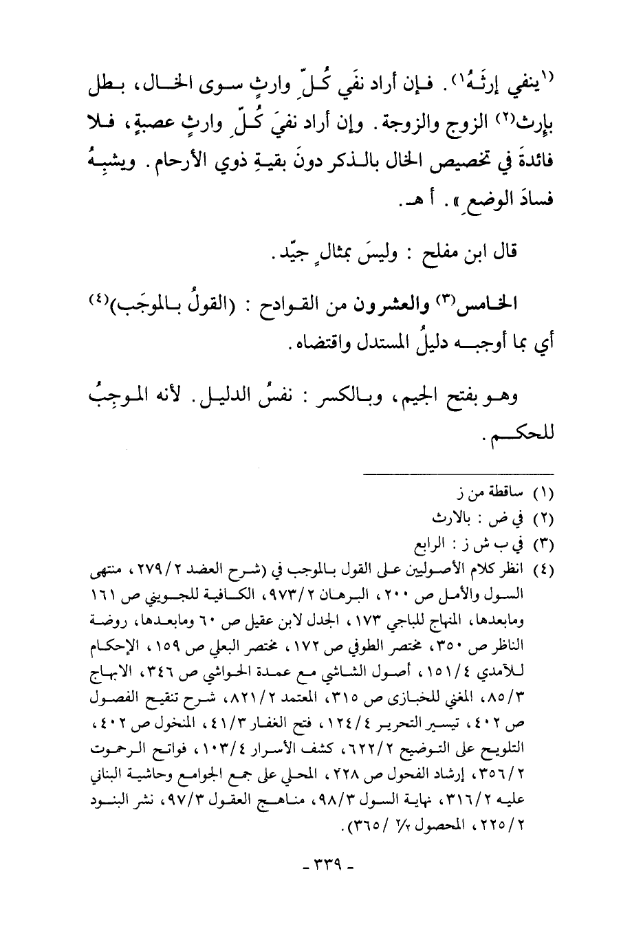 4 انظر كلام الأصوليين على القول بالموجب في "شرح العضد 2/279، منتهى السول والأمل ص 200، البرهان 2/973، الكافية للجويني ص 161 وما بعدها، المنهاج للباجي 173، الجدل لابن عقيل ص 60 وما بعدها، روضة الناظر ص 350، مختصر الطوفي ص 172، مختصر البعلي ص 159، الإحكام للآمدي 4/151، أصول الشاشي مع عمدة الحواشي ص 346، الإبهاج 3/85، المغني للخبازي ص 351، المعتمد 2/821، شرح تنقيح الفصول ص 402، تيسير التحرير 4/124، فتح الغفار 3/41، المنخول ص 402، التلويح على التوضيح 2/622، كشف الأسرار 4/103، فواتح الرحموت 2/356، إرشاد الفحول ص 228، المحلي على جمع الجوامع وحاشية البناني عليه 2/316، نهاية السول 3/98، مناهج العقول 3/97، نشر البنود 2/225، المحصول 2/2/365".
