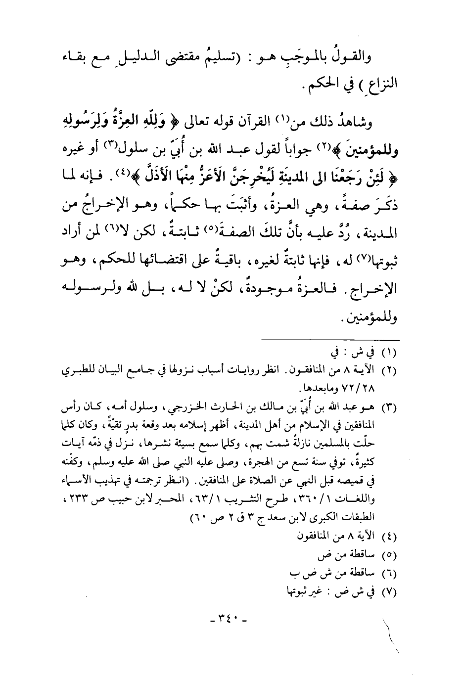 وَشَاهِدُ ذَلِكَ مِنْ1 الْقُرْآنِ قَوْله تَعَالَى: {وَلِلَّهِ الْعِزَّةُ وَلِرَسُولِهِ وَلِلْمُؤْمِنِينَ} 2 جَوَابًا لِقَوْلِ عَبْدِ اللَّهِ بْنِ أُبَيِّ ابْنِ سَلُولَ3 أَوْ غَيْرِهِ {لَئِنْ رَجَعْنَا إلَى الْمَدِينَةِ لَيُخْرِجَنَّ الأَعَزُّ مِنْهَا الأَذَلَّ} 4 فَإِنَّهُ لَمَّا ذَكَرَ صِفَةً - وَهِيَ الْعِزَّةُ - وَأَثْبَتَ بِهَا حُكْمًا - وَهُوَ الإِخْرَاجُ مِنْ الْمَدِينَةِ - رُدَّ عَلَيْهِ بِأَنَّ تِلْكَ الصِّفَةَ5 ثَابِتَةٌ، لَكِنْ لا6 لِمَنْ أَرَادَ ثُبُوتَهَا7 لَهُ، فَإِنَّهَا ثَابِتَةٌ لِغَيْرِهِ، بَاقِيَةٌ عَلَى اقْتِضَائِهَا لِلْحُكْمِ، وَهُوَ الإِخْرَاجُ. فَالْعِزَّةُ مَوْجُودَةٌ، لَكِنْ لا لَهُ، بَلْ لِلَّهِ وَلِرَسُولِهِ وَلِلْمُؤْمِنِينَ.