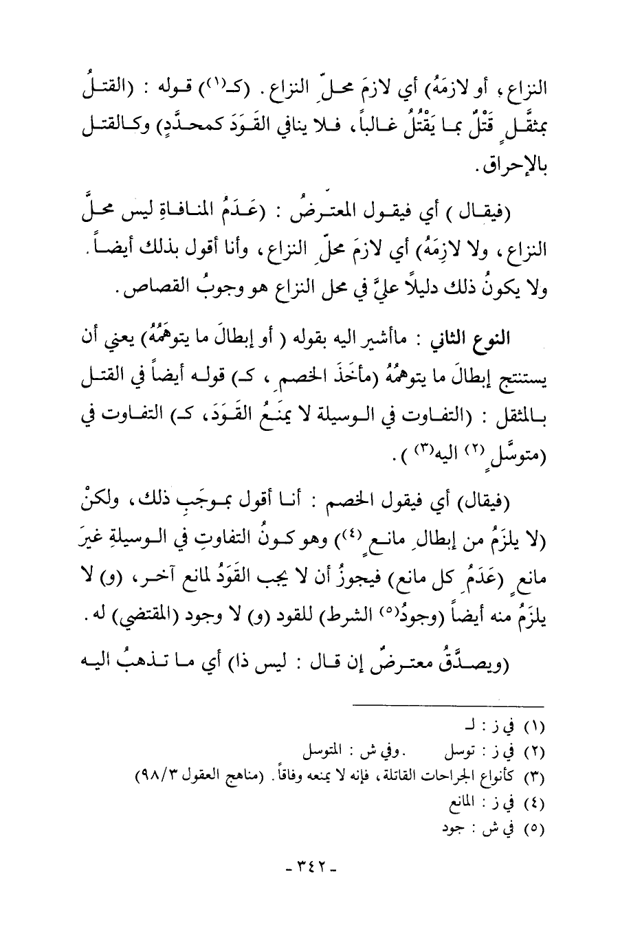 "فَيُقَالُ" أَيْ فَيَقُولُ الْخَصْمُ: أَنَا أَقُولُ بِمُوجَبِ ذَلِكَ، وَلَكِنْ "لا يَلْزَمُ مِنْ إبْطَالِ مَانِعٍ4" وَهُوَ كَوْنُ التَّفَاوُتِ فِي الْوَسِيلَةِ غَيْرَ مَانِعٍ "عَدَمُ كُلِّ مَانِعٍ" فَيَجُوزُ أَنْ لا يَجِبَ الْقَوَدُ لِمَانِعٍ آخَرَ "وَ" لا يَلْزَمُ مِنْهُ أَيْضًا "وُجُودُ5 الشَّرْطِ" لِلْقَوَدِ "وَ" لا وُجُودُ "الْمُقْتَضِي" لَهُ.