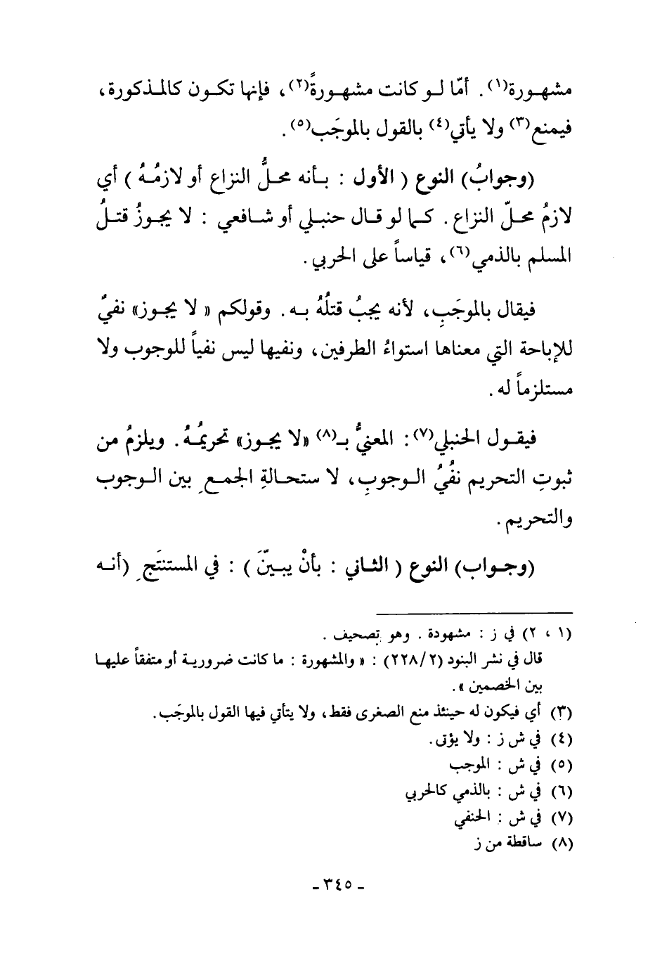 "وَجَوَابُ" النَّوْعِ "الأَوَّلِ: بِأَنَّهُ مَحَلُّ النِّزَاعِ أَوْ لازِمُهُ" أَيْ لازِمُ مَحَلِّ النِّزَاعِ. كَمَا لَوْ قَالَ حَنْبَلِيٌّ أَوْ شَافِعِيٌّ: لا يَجُوزُ قَتْلُ الْمُسْلِمِ بِالذِّمِّيِّ6 قِيَاسًا عَلَى الْحَرْبِيِّ.