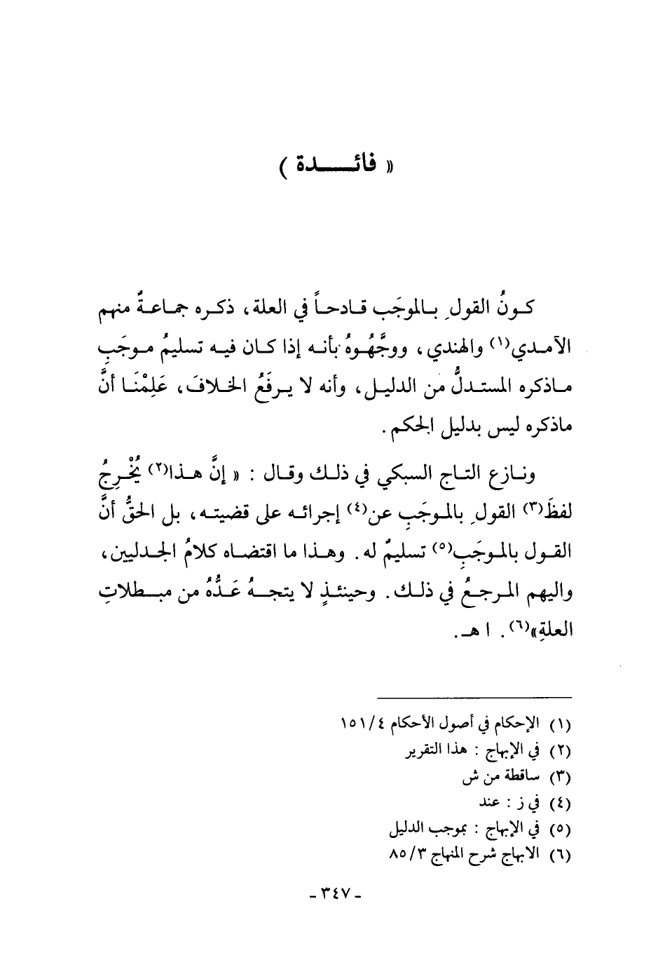 كَوْنُ الْقَوْلِ بِالْمُوجَبِ قَادِحًا فِي الْعِلَّةِ ذَكَرَهُ جَمَاعَةٌ. مِنْهُمْ الآمِدِيُّ1 وَالْهِنْدِيُّ، وَوَجَّهُوهُ بِأَنَّهُ إذَا كَانَ فِيهِ تَسْلِيمُ مُوجَبِ مَا ذَكَرَهُ الْمُسْتَدِلُّ مِنْ الدَّلِيلِ، وَأَنَّهُ لا يَرْفَعُ الْخِلافَ عَلِمْنَا أَنَّ مَا ذَكَرَهُ لَيْسَ بِدَلِيلِ الْحُكْمِ.