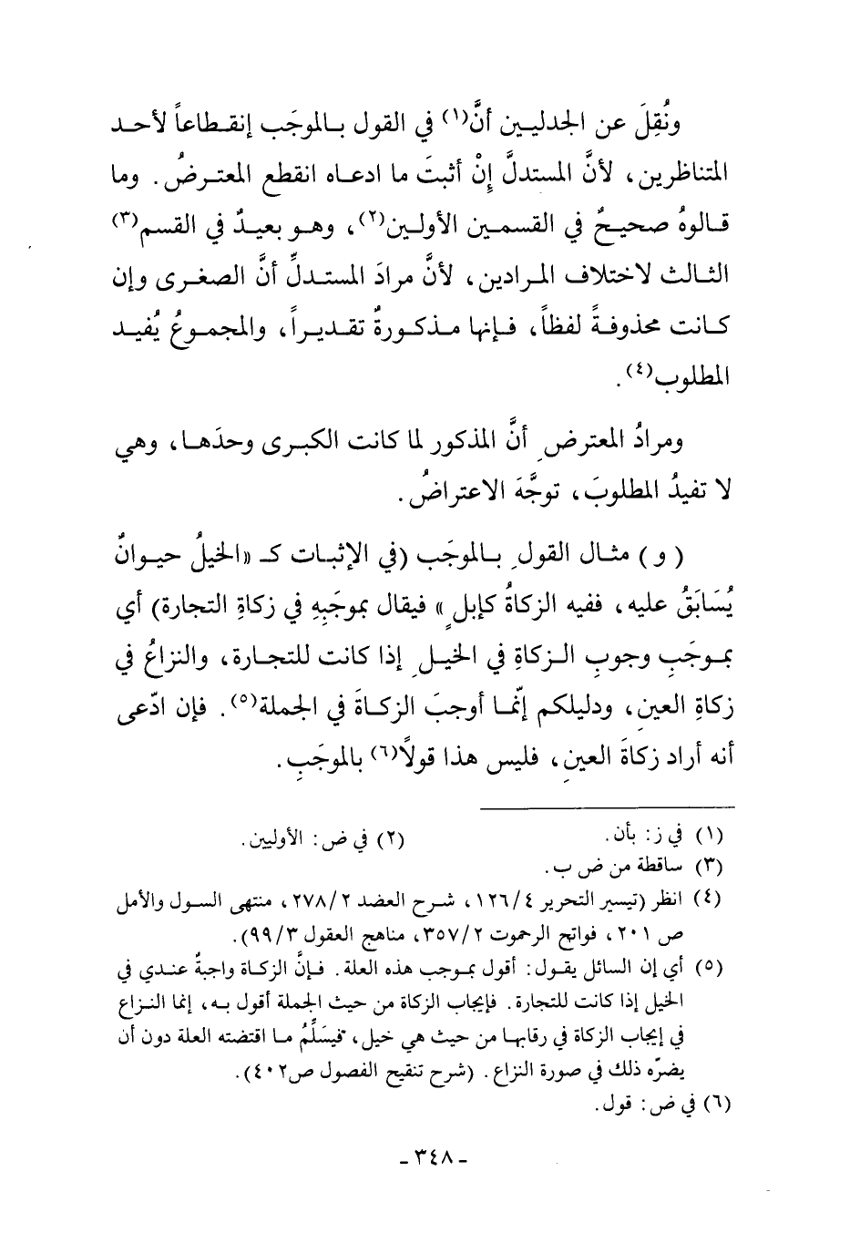 وَنُقِلَ عَنْ الْجَدَلِيِّينَ أَنَّ1 فِي الْقَوْلِ بِالْمُوجَبِ انْقِطَاعًا لأَحَدِ الْمُتَنَاظِرَيْنِ؛ لأَنَّ الْمُسْتَدِلَّ إنْ أَثْبَتَ مَا ادَّعَاهُ انْقَطَعَ الْمُعْتَرِضُ، وَمَا قَالُوهُ صَحِيحٌ فِي الْقِسْمَيْنِ الأَوَّلَيْنِ2، وَهُوَ بَعِيدٌ فِي الْقِسْمِ3 الثَّالِثِ؛ لاخْتِلافِ الْمُرَادَيْنِ؛ لأَنَّ مُرَادَ الْمُسْتَدِلِّ أَنَّ الصُّغْرَى - وَإِنْ كَانَتْ مَحْذُوفَةً لَفْظًا - فَإِنَّهَا مَذْكُورَةٌ تَقْدِيرًا وَالْمَجْمُوعُ يُفِيدُ الْمَطْلُوبَ4.