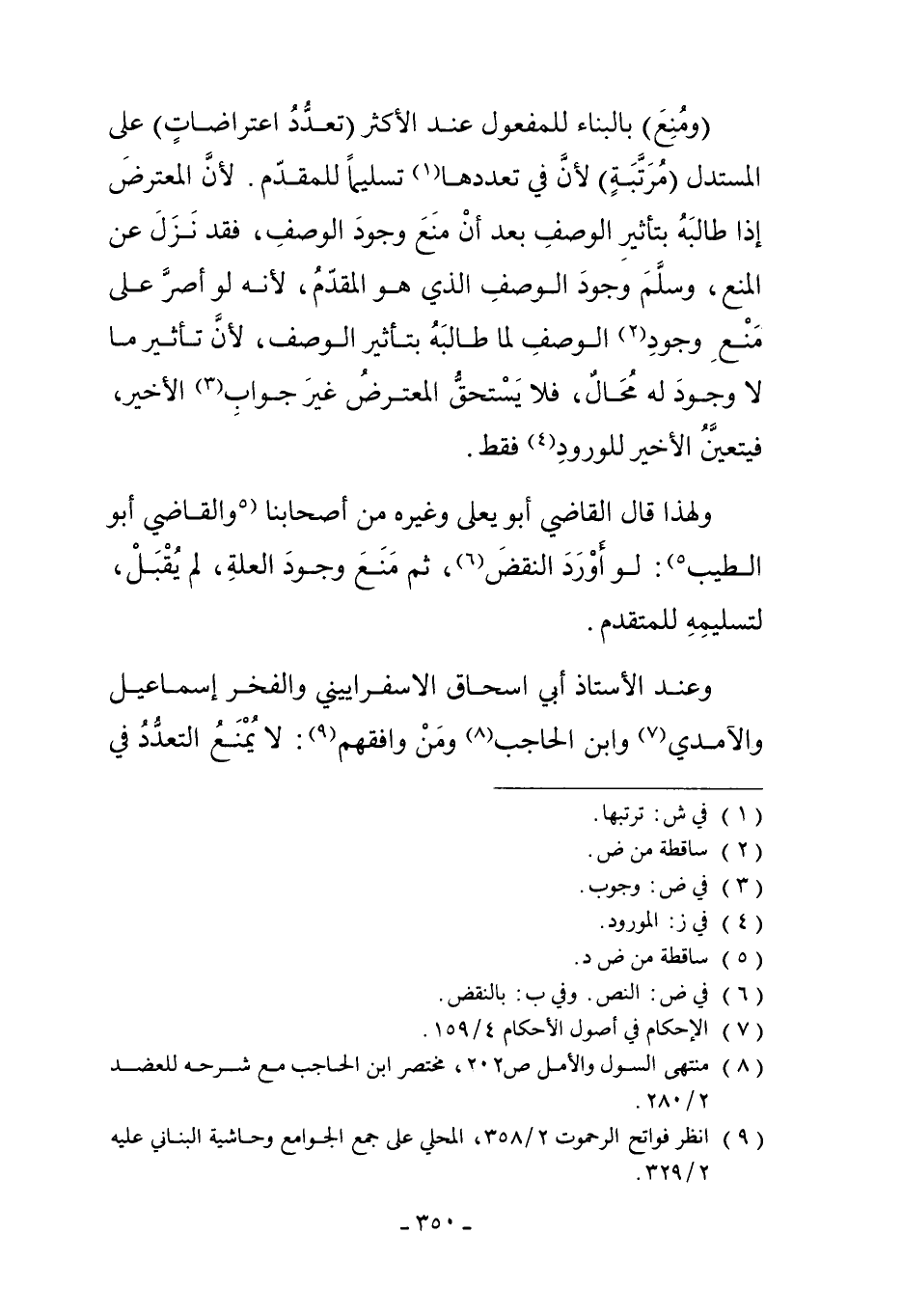 "وَمُنِعَ" بِالْبِنَاءِ لِلْمَفْعُولِ عِنْدَ الأَكْثَرِ "تَعَدُّدُ اعْتِرَاضَاتٍ" عَلَى الْمُسْتَدِلِّ "مُرَتَّبَةٍ"؛ لأَنَّ فِي تَعَدُّدِهَا1 تَسْلِيمًا لِلْمُقَدَّمِ؛ لأَنَّ الْمُعْتَرِضَ إذَا طَالَبَهُ بِتَأْثِيرِ الْوَصْفِ بَعْدَ أَنْ مَنَعَ وُجُودَ الْوَصْفِ فَقَدْ نَزَلَ عَنْ الْمَنْعِ وَسَلَّمَ وُجُودَ الْوَصْفِ الَّذِي هُوَ الْمُقَدَّمُ؛ لأَنَّهُ لَوْ أَصَرَّ عَلَى مَنْعِ وُجُودِ2 الْوَصْفِ لَمَّا طَالَبَهُ بِتَأْثِيرِ الْوَصْفِ؛ لأَنَّ تَأْثِيرَ مَا لا وُجُودَ لَهُ مُحَالٌ، فَلا يَسْتَحِقُّ الْمُعْتَرِضُ غَيْرَ جَوَابِ3 الأَخِيرِ، فَيَتَعَيَّنُ الأَخِيرُ لِلْوُرُودِ4 فَقَطْ.