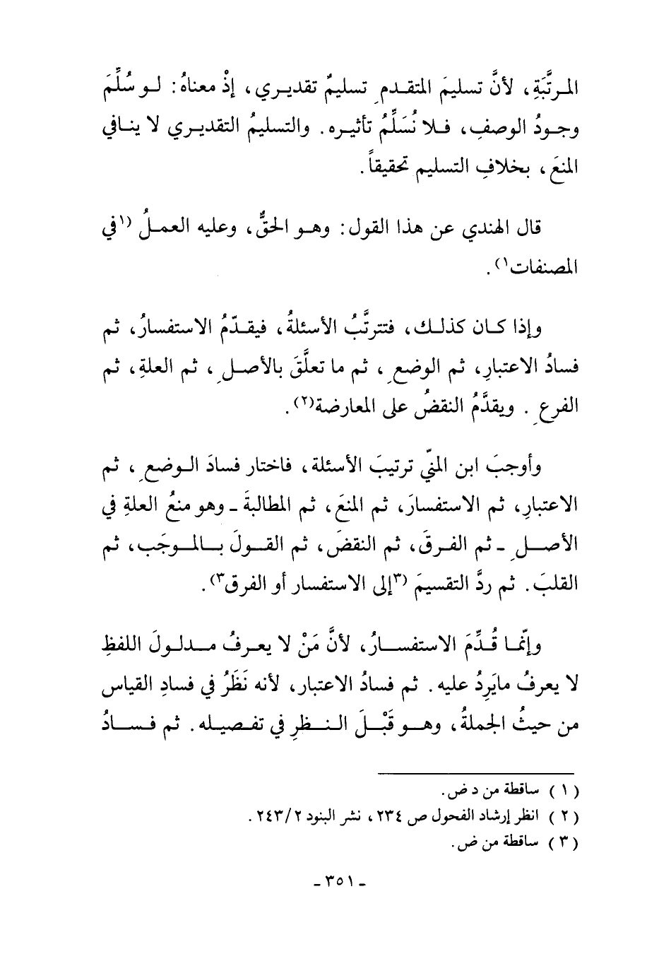 الْمُرَتَّبَةِ؛ لأَنَّ تَسْلِيمَ الْمُتَقَدِّمِ تَسْلِيمٌ تَقْدِيرِيٌّ، إذْ مَعْنَاهُ: لَوْ سُلِّمَ وُجُودُ الْوَصْفِ فَلا نُسَلِّمُ تَأْثِيرَهُ. وَالتَّسْلِيمُ التَّقْدِيرِيُّ: لا يُنَافِي الْمَنْعَ، بِخِلافِ التَّسْلِيمِ تَحْقِيقًا.