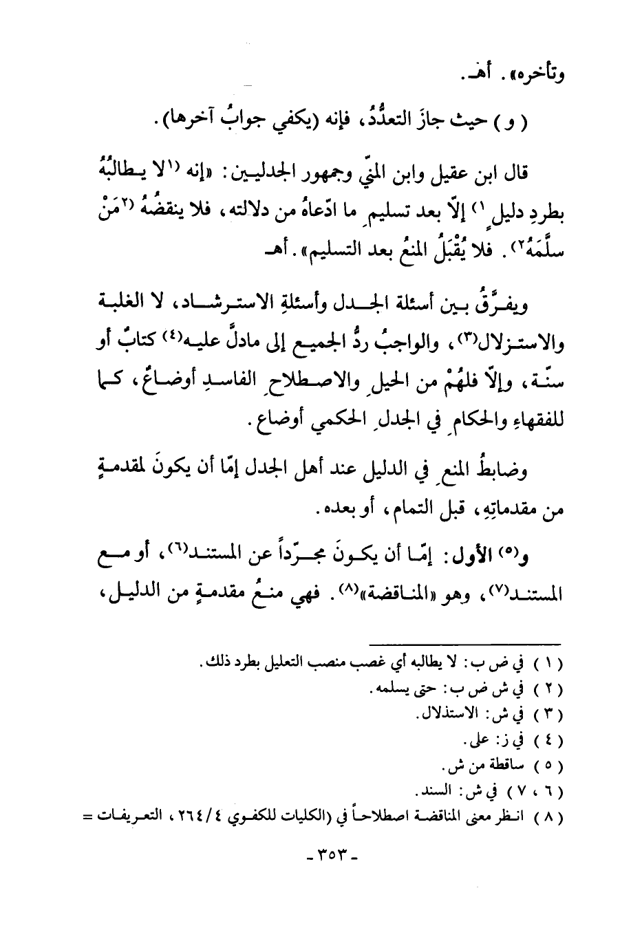 و5َالأَوَّلُ: إمَّا أَنْ يَكُونَ مُجَرَّدًا عَنْ الْمُسْتَنَدِ6، أَوْ مَعَ الْمُسْتَنَدِ7، وَهُوَ الْمُنَاقَضَةُ8، فَهِيَ مَنْعُ مُقَدِّمَةٍ مِنْ الدَّلِيلِ،