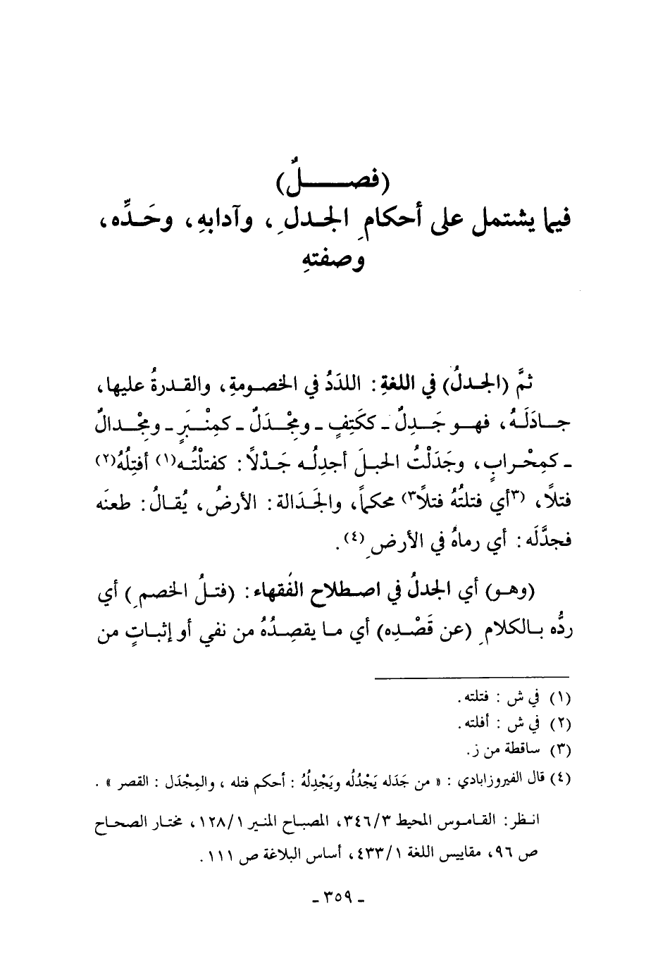 "فصل": فِيمَا يَشْتَمِلُ عَلَى أَحْكَامِ الْجَدَلِ، وَآدَابِهِ، وَحَدِّهِ، وَصِفَتِهِ.