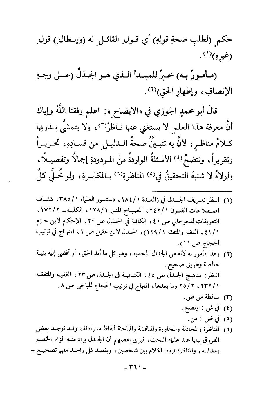 1 انظر تعريف الجدل في "العِدة 1/184، دستور العلماء 1/385، كشاف اصطلاحات الفنون 1/242، المصباح المنير 1/128، الكليات 2/172، التعريفات للجرجاني ص 41، الكافية في الجدل ص 20، الإحكام لابن حزم 1/41، الفقيه والمتفقه 1/229"، الجدل لابن عقيل ص 1، المنهاج في ترتيب الحجاج ص 11".