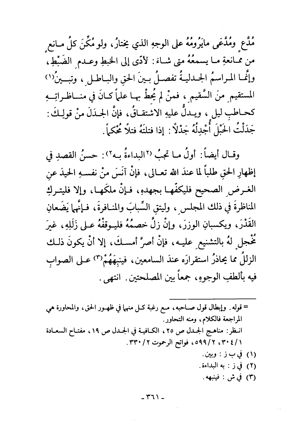 وَقَالَ أَيْضًا: أَوَّلُ مَا تَجِبُ الْبُدَاءَةُ بِهِ2: حُسْنُ الْقَصْدِ فِي إظْهَارِ الْحَقِّ طَلَبًا لِمَا عِنْدَ اللَّهِ تَعَالَى فَإِنْ آنَسَ مِنْ نَفْسِهِ الْحَيْدَ عَنْ الْغَرَضِ الصَّحِيحِ فَلْيَكُفَّهَا بِجَهْدِهِ، فَإِنْ مَلَكَهَا، وَإِلاَّ فَلْيَتْرُكْ الْمُنَاظَرَةَ فِي ذَلِكَ الْمَجْلِسِ، وَلْيَتَّقِ السِّبَابَ وَالْمُنَافَرَةَ فَإِنَّهُمَا يَضَعَانِ الْقَدْرَ، وَيُكْسِبَانِ الْوِزْرَ، وَإِنْ زَلَّ خَصْمُهُ فَلْيُوقِفْهُ عَلَى زَلَلِهِ، غَيْرَ مُخْجِلٍ لَهُ بِالتَّشْنِيعِ عَلَيْهِ. فَإِنْ أَصَرَّ أَمْسَكَ، إلاَّ أَنْ يَكُونَ ذَلِكَ الزَّلَلُ مِمَّا يُحَاذِرُ اسْتِقْرَارَهُ عِنْدَ السَّامِعِينَ، فَيُنَبِّهُهُمْ3 عَلَى الصَّوَابِ فِيهِ بِأَلْطَفِ الْوُجُوهِ جَمْعًا بَيْنَ الْمَصْلَحَتَيْنِ. انتهى.
