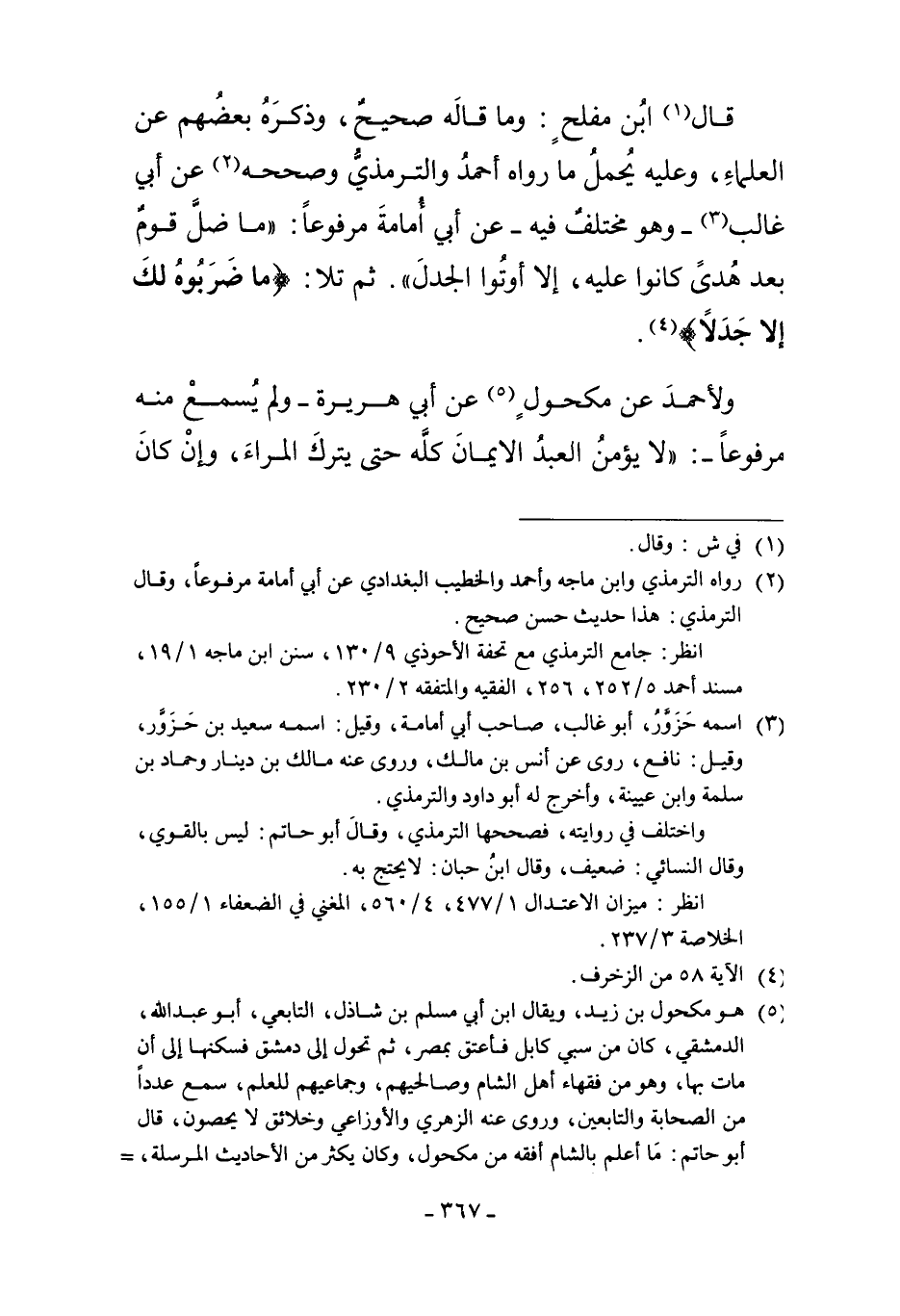 قَالَ1 ابْنُ مُفْلِحٍ: وَمَا قَالَهُ صَحِيحٌ، وَذَكَرَهُ بَعْضُهُمْ عَنْ الْعُلَمَاءِ، وَعَلَيْهِ يُحْمَلُ مَا رَوَاهُ أَحْمَدُ وَالتِّرْمِذِيُّ وَصَحَّحَهُ2 عَنْ أَبِي غَالِبٍ3 -وَهُوَ مُخْتَلَفٌ فِيهِ- عَنْ أَبِي أُمَامَةَ مَرْفُوعًا "مَا ضَلَّ قَوْمٌ بَعْدَ هُدًى كَانُوا عَلَيْهِ إلاَّ أُوتُوا الْجَدَلَ" ثُمَّ تَلا: {مَا ضَرَبُوهُ لَك إلاَّ جَدَلاً} 4.