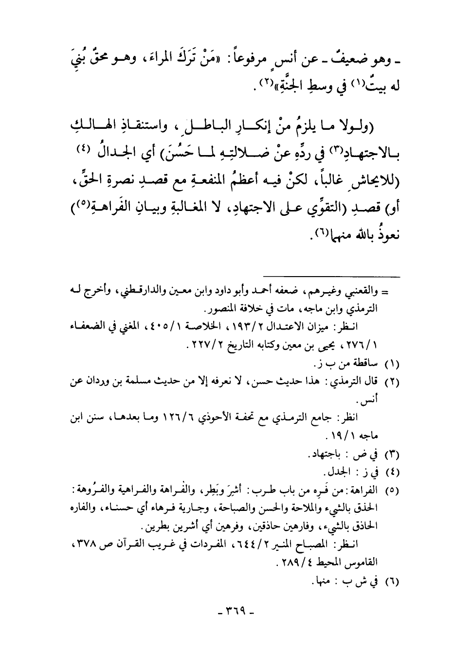-وَهُوَ ضَعِيفٌ- عَنْ أَنَسٍ مَرْفُوعًا "مَنْ تَرَكَ الْمِرَاءَ وَهُوَ مُحِقٌّ بُنِيَ لَهُ بَيْتٌ1 فِي وَسَطِ الْجَنَّةِ"2.