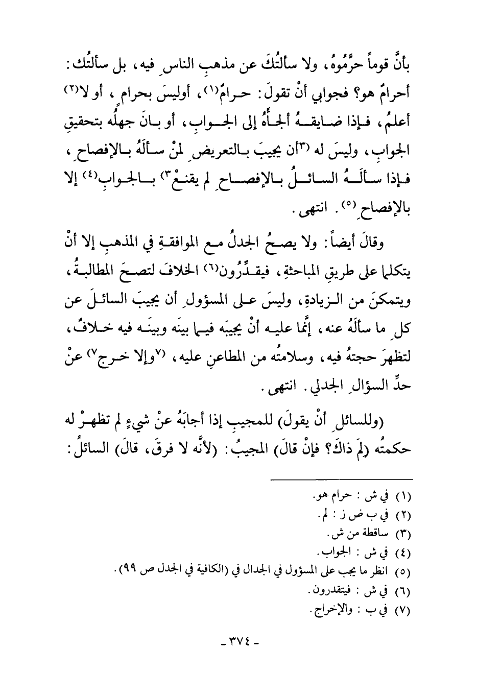 وَقَالَ أَيْضًا: وَلا يَصِحُّ الْجَدَلُ مَعَ الْمُوَافَقَةِ فِي الْمَذْهَبِ، إلاَّ أَنْ يَتَكَلَّمَا عَلَى طَرِيقِ الْمُبَاحَثَةِ، فَيَتَقَدَّرُونَ6 الْخِلافَ لِتَصِحَّ الْمُطَالَبَةُ، وَيَتَمَكَّنَ مِنْ الزِّيَادَةِ وَلَيْسَ عَلَى الْمَسْئُولِ أَنْ يُجِيبَ السَّائِلَ عَنْ كُلِّ مَا سَأَلَهُ عَنْهُ إنَّمَا عَلَيْهِ أَنْ يُجِيبَهُ فِيمَا بَيْنَهُ وَبَيْنَهُ فِيهِ خِلافٌ، لِتَظْهَرَ حُجَّتُهُ فِيهِ وَسَلامَتُهُ عَنْ الْمَطَاعِنِ عَلَيْهِ، وَإِلاَّ خَرَجَ7 عَنْ حَدِّ السُّؤَالِ الْجَدَلِيِّ. انْتَهَى.