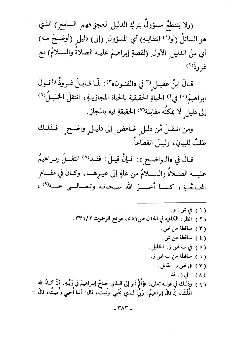 قَالَ ابْنُ عَقِيلٍ فِي الْفُنُونِ3: لَمَّا قَابَلَ نُمْرُوذُ4 قَوْلَ إبْرَاهِيمَ5 فِي الْحَيَاةِ الْحَقِيقِيَّةِ بِالْحَيَاةِ الْمَجَازِيَّةِ، انْتَقَلَ الْخَلِيلُ6 إلَى دَلِيلٍ لا يُمْكِنُهُ مُقَابَلَةُ7 الْحَقِيقَةِ فِيهِ بِالْمَجَازِ.