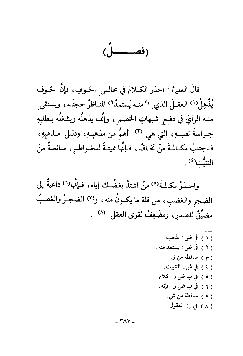 قَالَ الْعُلَمَاءُ: احْذَرْ الْكَلامَ فِي مَجَالِسِ الْخَوْفِ، فَإِنَّ الْخَوْفَ يُذْهِلُ1 الْعَقْلَ الَّذِي مِنْهُ يَسْتَمِدُّ2 الْمُنَاظِرُ حُجَّتَهُ، وَيَسْتَقِي مِنْهُ الرَّأْيَ فِي دَفْعِ شُبُهَاتِ الْخَصْمِ، وَإِنَّمَا يُذْهِلُهُ وَيَشْغَلُهُ بِطَلَبِهِ حِرَاسَةَ نَفْسِهِ، الَّتِي هِيَ3 أَهَمُّ مِنْ مَذْهَبِهِ وَدَلِيلِ مَذْهَبِهِ، فَاجْتَنِبْ مُكَالَمَةَ مَنْ تَخَافُ، فَإِنَّهَا مُمِيتَةٌ لِلْخَوَاطِرِ، مَانِعَةٌ مِنْ التَّثَبُّتِ4.