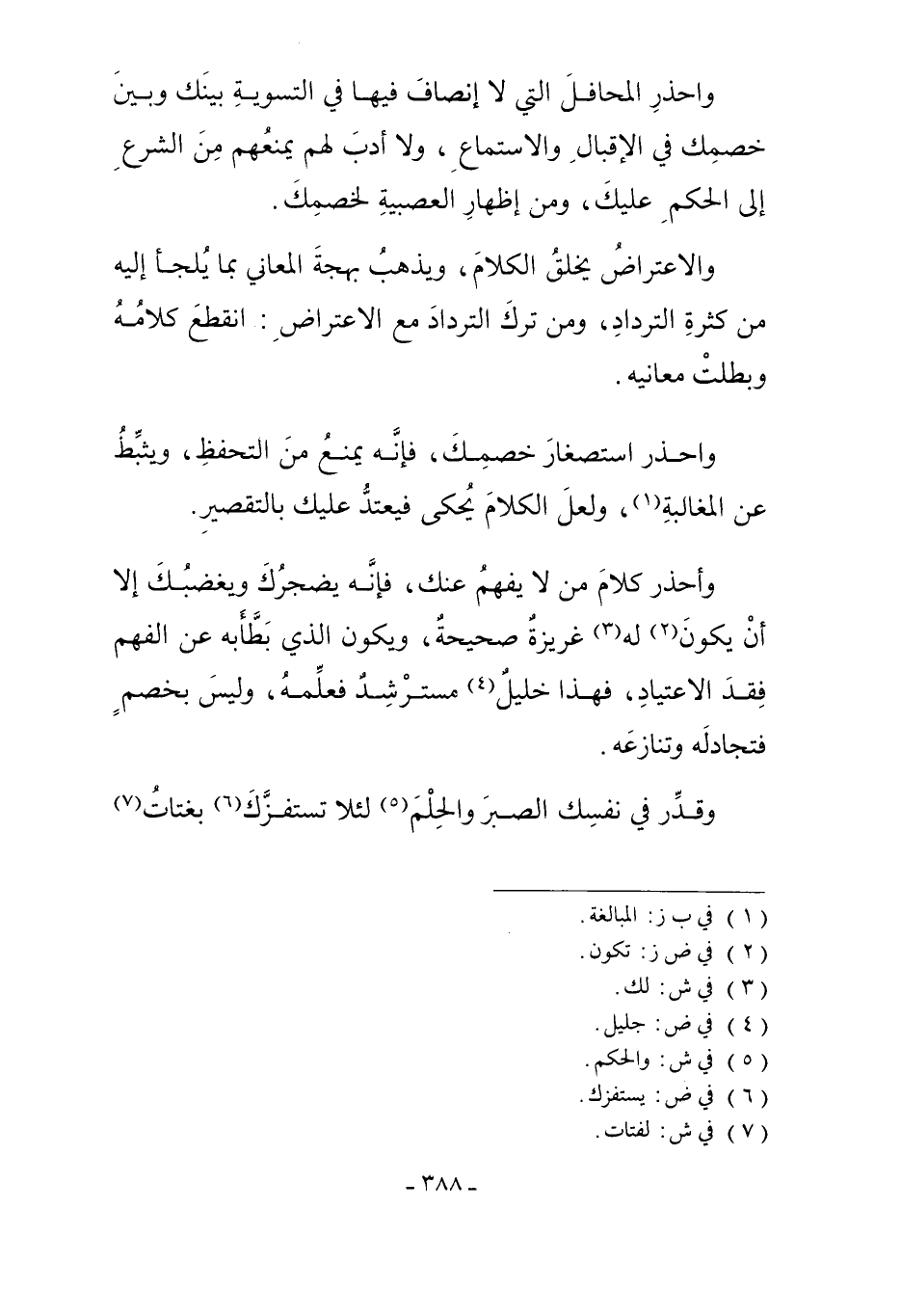 وَاحْذَرْ كَلامَ مَنْ لا يَفْهَمُ عَنْكَ، فَإِنَّهُ يُضْجِرُكَ وَيُغْضِبُكَ إلاَّ أَنْ يَكُونَ2 لَهُ3 غَرِيزَةٌ صَحِيحَةٌ، وَيَكُونَ الَّذِي بَطَّأَ بِهِ عَنْ الْفَهْمِ فَقْدُ الاعْتِيَادِ، فَهَذَا خَلِيلٌ4 مُسْتَرْشِدٌ فَعَلِّمْهُ، وَلَيْسَ بِخَصْمٍ فَتُجَادِلُهُ وَتُنَازِعُهُ.