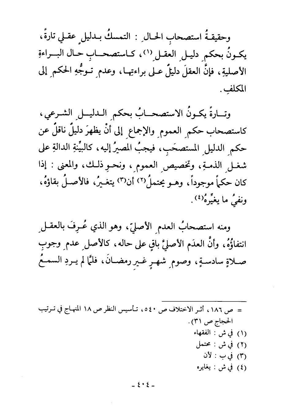 وَحَقِيقَةُ اسْتِصْحَابِ الْحَالِ: التَّمَسُّكُ بِدَلِيلٍ عَقْلِيٍّ تَارَةً يَكُونُ بِحُكْمِ دَلِيلِ الْعَقْلِ1، كَاسْتِصْحَابِ حَالِ الْبَرَاءَةِ الأَصْلِيَّةِ، فَإِنَّ الْعَقْلَ دَلِيلٌ عَلَى بَرَاءَتِهَا وَعَدَمِ تَوَجُّهِ الْحُكْمِ إلَى الْمُكَلَّفِ.