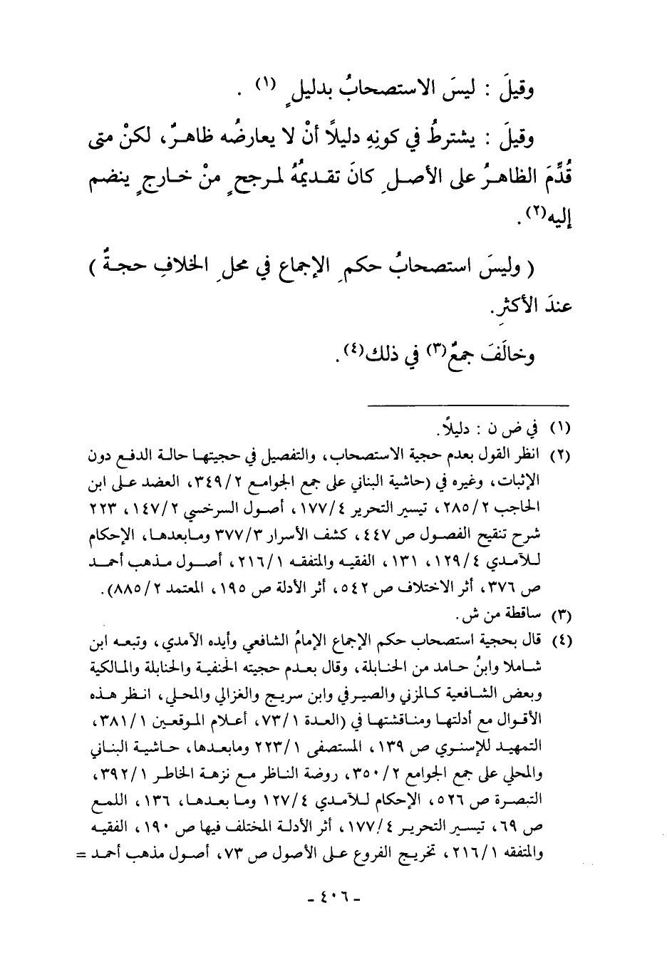 2 انظر القول بعدم حجية الاستصحاب، والتفصيل في حجيتها حالة الدفع دون الإثبات، وغيره في "حاشية البناني على جمع الجوامع 2/349، العضد على ابن الحاجب 2/285، تيسير التحرير 4/177، أصول السرخسي 2/147، 223، شرح تنقيح الفصول ص 447، كشف الأسرار 3/377 وما بعدها، الإحكام للآمدي 4/129، 131، الفقيه المتفقه 1/216، أصول مذهب أحمد ص 376، أثر الاختلاف ص 542، أثر الأدلة ص 195، المعتمد 2/885".