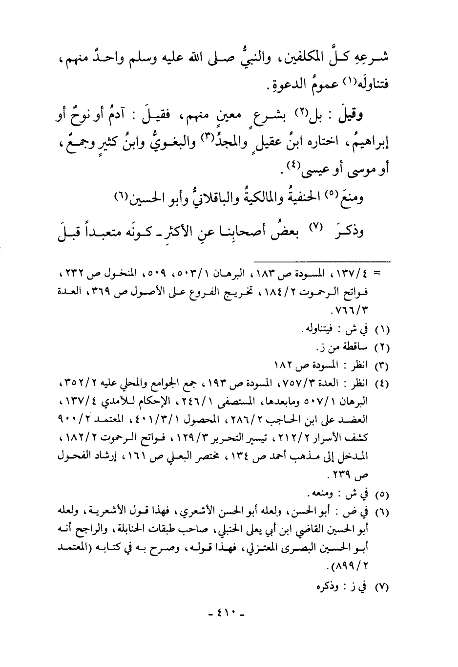 6 في ض: أبو الحسن، ولعله أبو الحسن الأشعري، فهذا قول الأشعرية، ولعله أبو الحسين القاضي ابن أبي يعلى الحنبلي، صاحب طبقات الحنابلة، والراجح أنه أبو الحسين البصري المعتزلي، فهذا قوله، وصرح به في كتابه "المعتمد 2/899".
