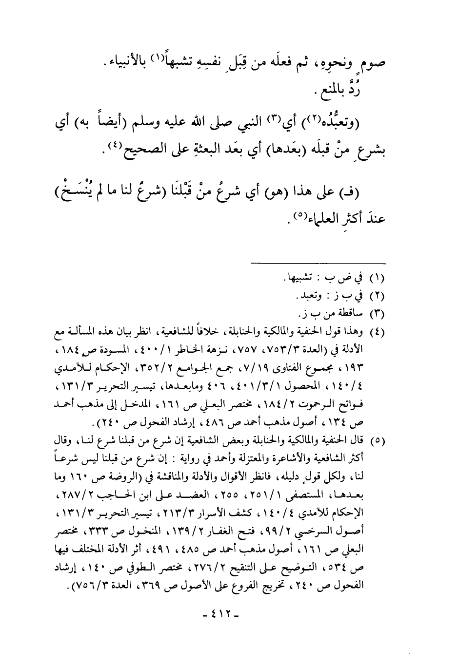 5 قال الحنفية والمالكية والحنابلة وبعض الشافعية إن شرع من قبلنا شرع لنا، وقال أكثر الشافعية والأشاعرة والمعتزلة وأحمد في رواية: إن شرع من قبلنا ليس شرعاً لنا، ولكل قول دليله، فانظر الأقوال والأدلة والمناقشة في "الروضة ص 160 وما بعدها، المستصفى 1/251، 255، العضد على ابن الحاجب 2/287، الإحكام للآمدي 4/140، كشف الأسرار 3/213، تيسير التحرير 3/131، أصول السرخسي 2/99، فتح الغفار 2/139، المنخول ص 333، مختصر البعلي ص 161، أصول مذهب أحمد ص 485، 491، أثر الأدلة المختلف فيها ص 534، التوضيح على التنقيح 2/276، مختصر الطوفي ص 140، إرشاد الفحول ص 240، تخريج الفروع على الأصول ص 369، العدة 3/756".