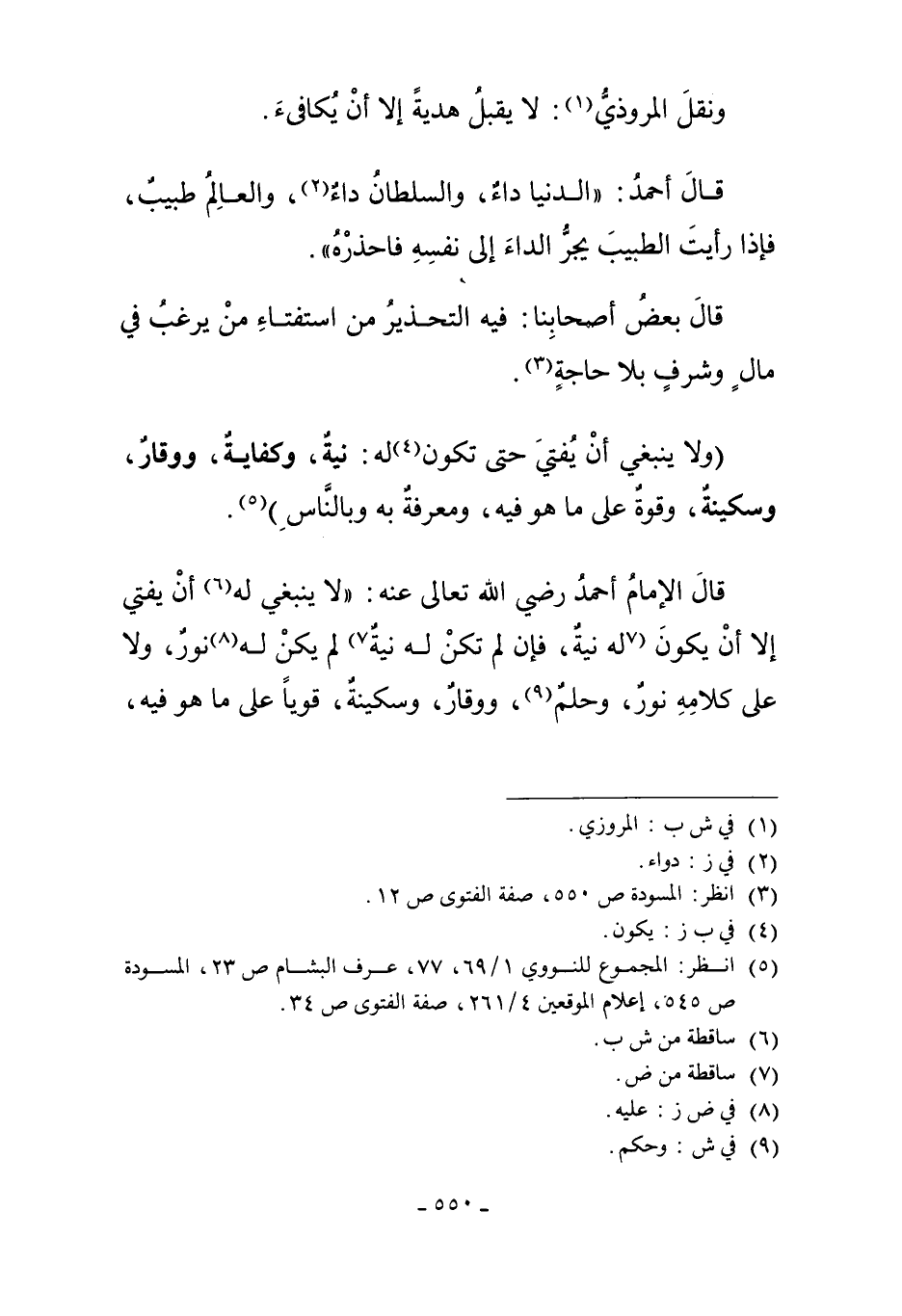 قَالَ الإِمَامُ أَحْمَدُ رَضِيَ اللَّهُ تَعَالَى عَنْهُ " لا يَنْبَغِي لَهُ6 أَنْ يُفْتِيَ إلاَّ أَنْ يَكُونَ لَهُ نِيَّةٌ، فَإِنْ لَمْ تَكُنْ لَهُ نِيَّةٌ7 لَمْ يَكُنْ لَهُ8 نُورٌ، وَلا عَلَى كَلامِهِ نُورٌ وَحِلْمٌ9، وَوَقَارٌ وَسَكِينَةٌ، قَوِيًّا عَلَى مَا هُوَ فِيهِ،