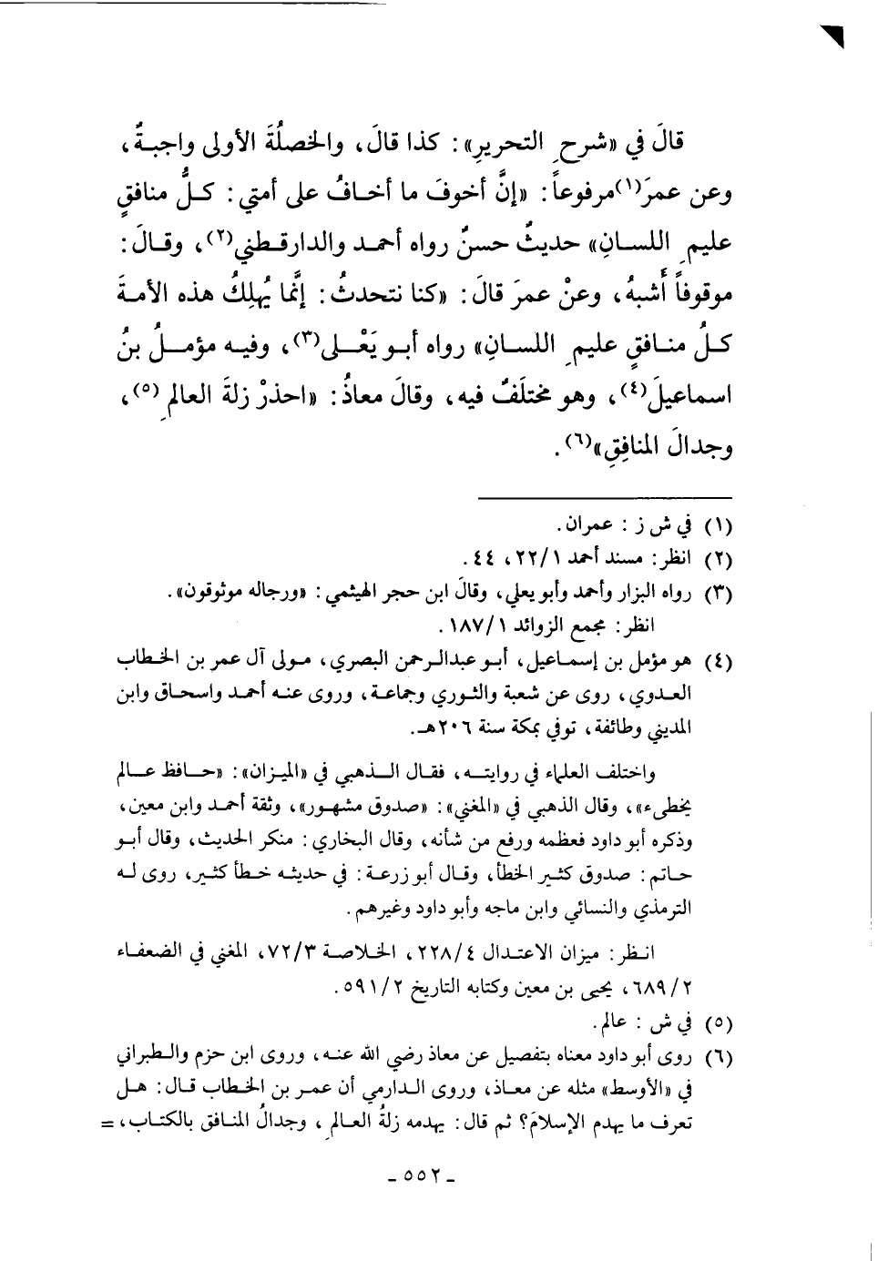 قَالَ فِي شَرْحِ التَّحْرِيرِ: كَذَا قَالَ. وَالْخَصْلَةُ الأُولَى وَاجِبَةٌ، وَعَنْ عُمَرَ1 مَرْفُوعًا: "إنَّ أَخْوَفَ مَا أَخَافُ عَلَى أُمَّتِي: كُلُّ مُنَافِقٍ عَلِيمُ اللِّسَانِ" حَدِيثٌ حَسَنٌ رَوَاهُ أَحْمَدُ وَالدَّارَقُطْنِيّ2، وَقَالَ: مَوْقُوفًا أَشْبَهُ، وَعَنْ عُمَرَ قَالَ "كُنَّا نَتَحَدَّثُ: إنَّمَا يُهْلِكُ هَذِهِ الأُمَّةَ كُلُّ مُنَافِقٍ عَلِيمِ اللِّسَانِ" رَوَاهُ أَبُو يَعْلَى3، وَفِيهِ مُؤَمَّلُ بْنُ إسْمَاعِيلَ4 وَهُوَ مُخْتَلَفٌ فِيهِ، وَقَالَ مُعَاذٌ: "احْذَرْ زَلَّةَ الْعَالِمِ5، وَجِدَالَ الْمُنَافِقِ"6.