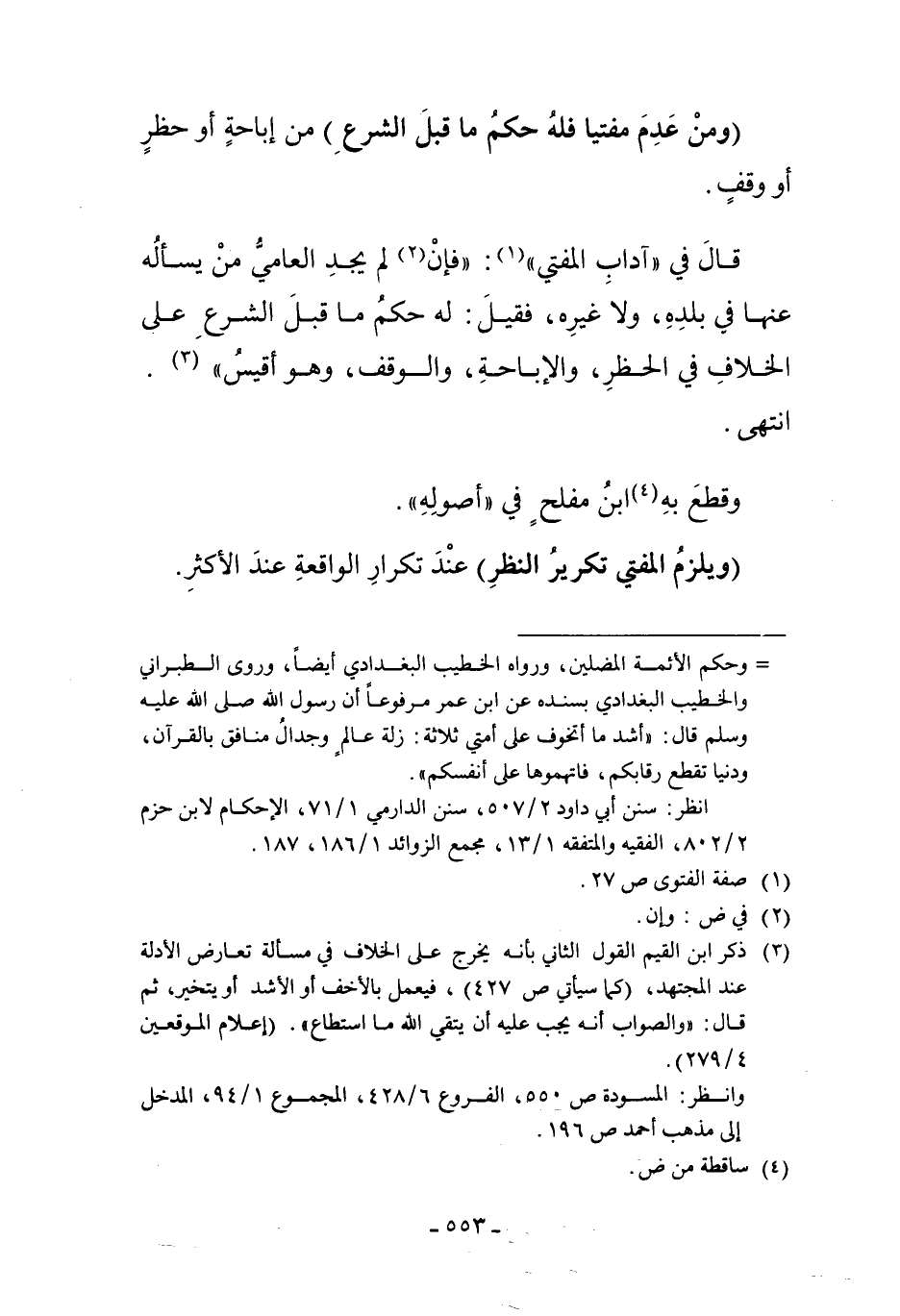 3 ذكر ابن القيم القول الثاني بأنه يخرج على الخلاف في مسألة تعارض الأدلة عند المجتهد، "كما سيأتي ص 427"، فيعمل بالأخف أو الأشد أو يتخير، ثم قال: "والصواب أنه يجب عليه أن يتقي الله ما استطاع". "إعلام الموقعين 4/279".