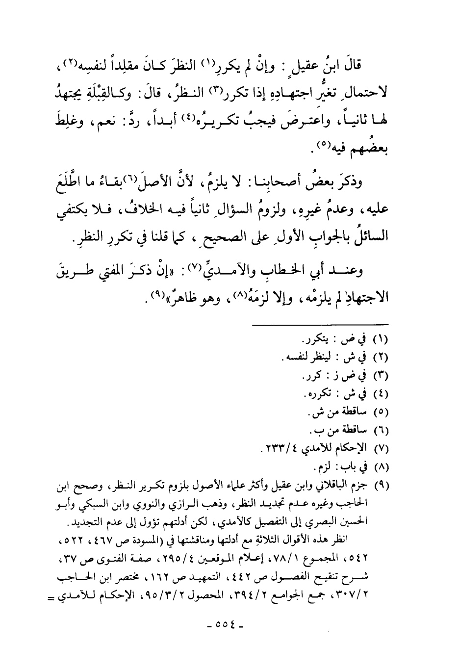 9 جزم الباقلاني وابن عقيل وأكثر علماء الأصول بلزوم تكرير النظر، وصحح ابن الحاجب وغيره عدم تجديد النظر، وذهب الرازي والنووي وابن السبكي وأبو الحسين البصري إلى التفصيل كالآمدي، ولكن أدلتهم تؤول إلى عدم التجديد.