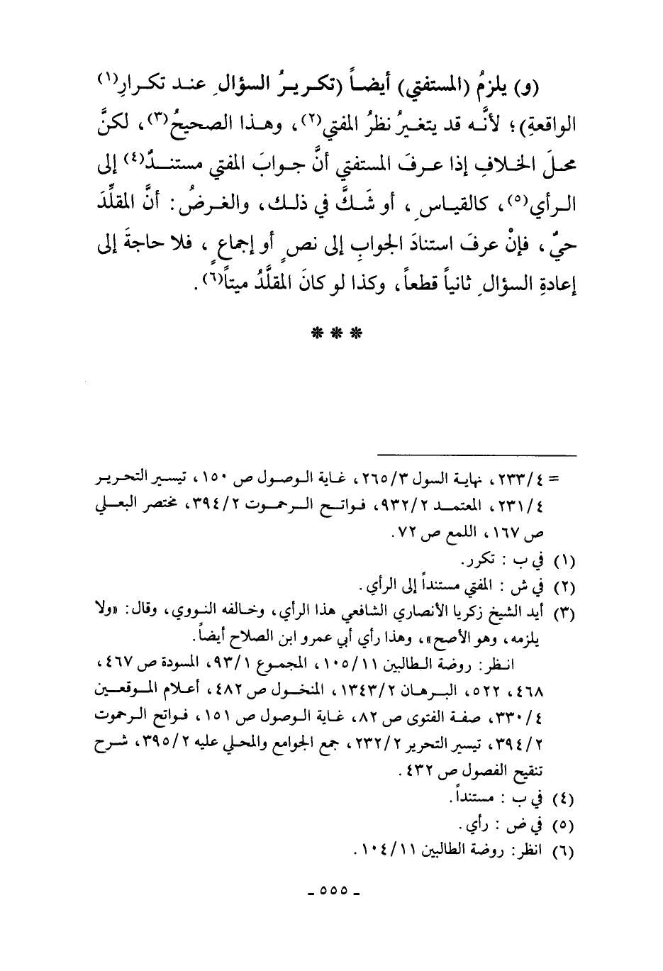 "وَ" يَلْزَمُ "الْمُسْتَفْتِيَ" أَيْضًا "تَكْرِيرُ السُّؤَالِ عِنْدَ تَكْرَارِ1 الْوَاقِعَةِ"؛ لأَنَّهُ قَدْ يَتَغَيَّرُ نَظَرُ الْمُفْتِي2 وَهَذَا الصَّحِيحُ3؛ لَكِنَّ مَحَلَّ الْخِلافِ إذَا عَرَفَ الْمُسْتَفْتِي أَنَّ جَوَابَ الْمُفْتِي مُسْتَنِدٌ4 إلَى الرَّأْيِ5. كَالْقِيَاسِ، أَوْ شَكَّ فِي ذَلِكَ، وَالْغَرَضُ: أَنَّ الْمُقَلَّدَ حَيٌّ، فَإِنْ عُرِفَ اسْتِنَادُ الْجَوَابِ إلَى نَصٍّ أَوْ إجْمَاعٍ، فَلا حَاجَةَ إلَى إعَادَةِ السُّؤَالِ ثَانِيًا قَطْعًا، وَكَذَا لَوْ كَانَ الْمُقَلَّدُ مَيِّتًا6.