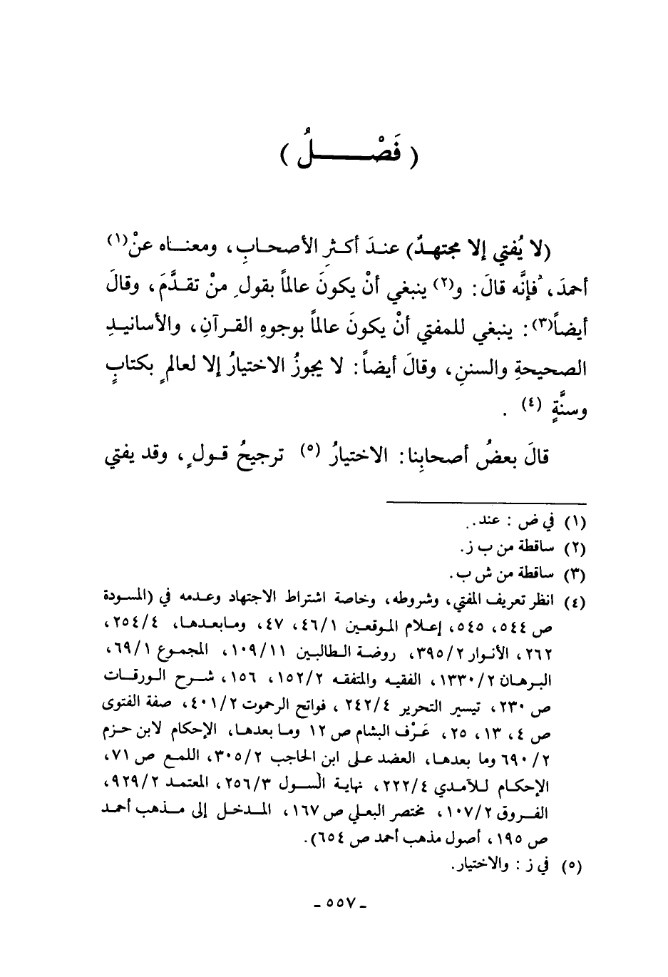 "لا يُفْتِي إلاَّ مُجْتَهِدٌ". عِنْدَ أَكْثَرِ الأَصْحَابِ، وَمَعْنَاهُ عَنْ1 أَحْمَدَ، فَإِنَّهُ قَالَ: وَ2يَنْبَغِي أَنْ يَكُونَ عَالِمًا بِقَوْلِ مَنْ تَقَدَّمَ، وَقَالَ أَيْضًا3: يَنْبَغِي لِلْمُفْتِي أَنْ يَكُونَ عَالِمًا بِوُجُوهِ الْقُرْآنِ، وَالأَسَانِيدِ الصَّحِيحَةِ وَالسُّنَنِ. وَقَالَ أَيْضًا: لا يَجُوزُ الاخْتِيَارُ إلاَّ لِعَالِمٍ بِكِتَابٍ وَسُنَّةٍ4.