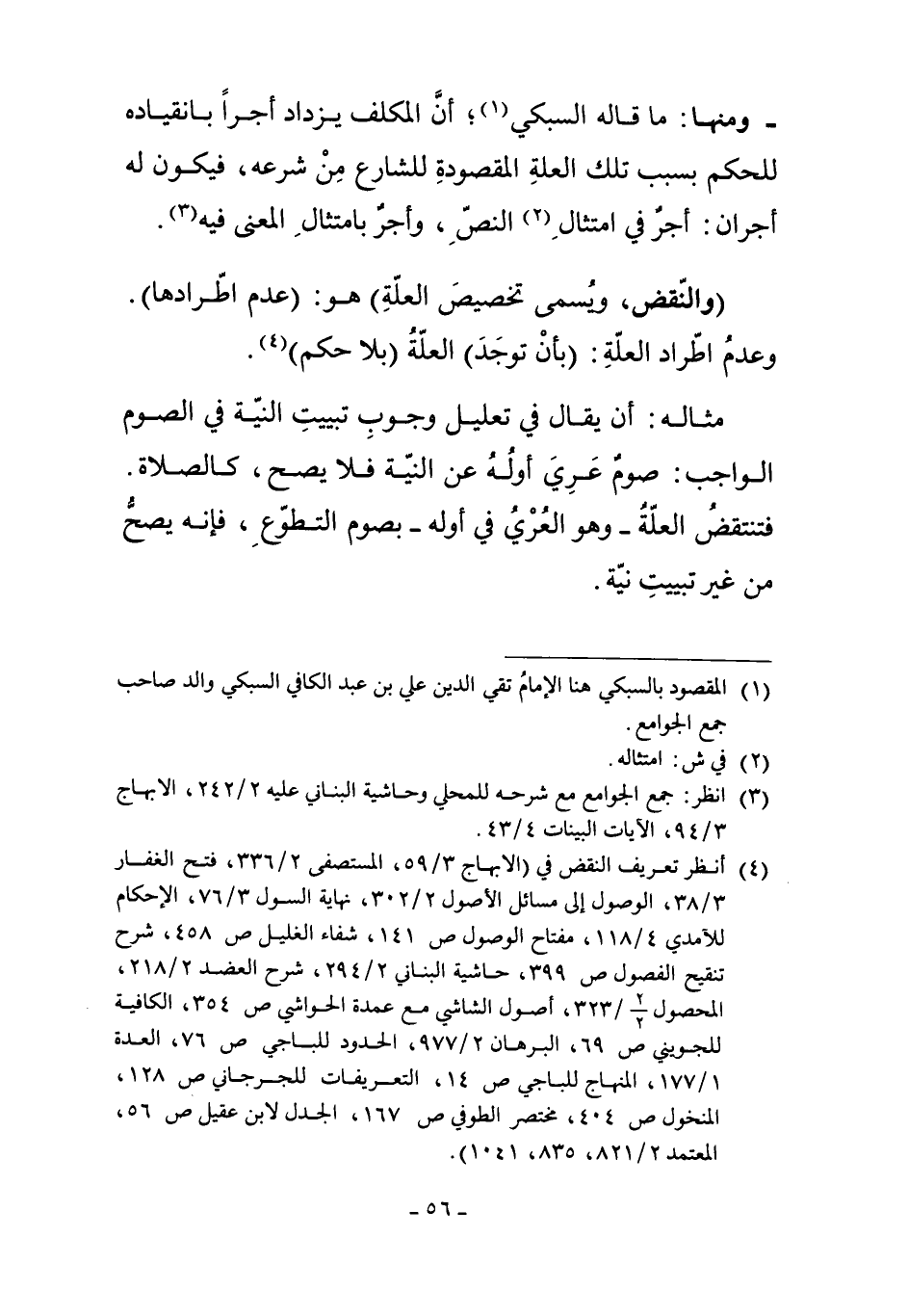 مِثَالُهُ: أَنْ يُقَالَ فِي تَعْلِيلِ وُجُوبِ تَبْيِيتِ النِّيَّةِ فِي الصَّوْمِ الْوَاجِبِ: صَوْمٌ عَرِيَ أَوَّلُهُ عَنْ النِّيَّةِ فَلا يَصِحُّ، كَالصَّلاةِ، فَتَنْتَقِضُ الْعِلَّةُ - وَهُوَ الْعُرْيُ فِي أَوَّلِهِ - بِصَوْمِ التَّطَوُّعِ، فَإِنَّهُ يَصِحُّ مِنْ غَيْرِ تَبْيِيتِ نِيَّةٍ.