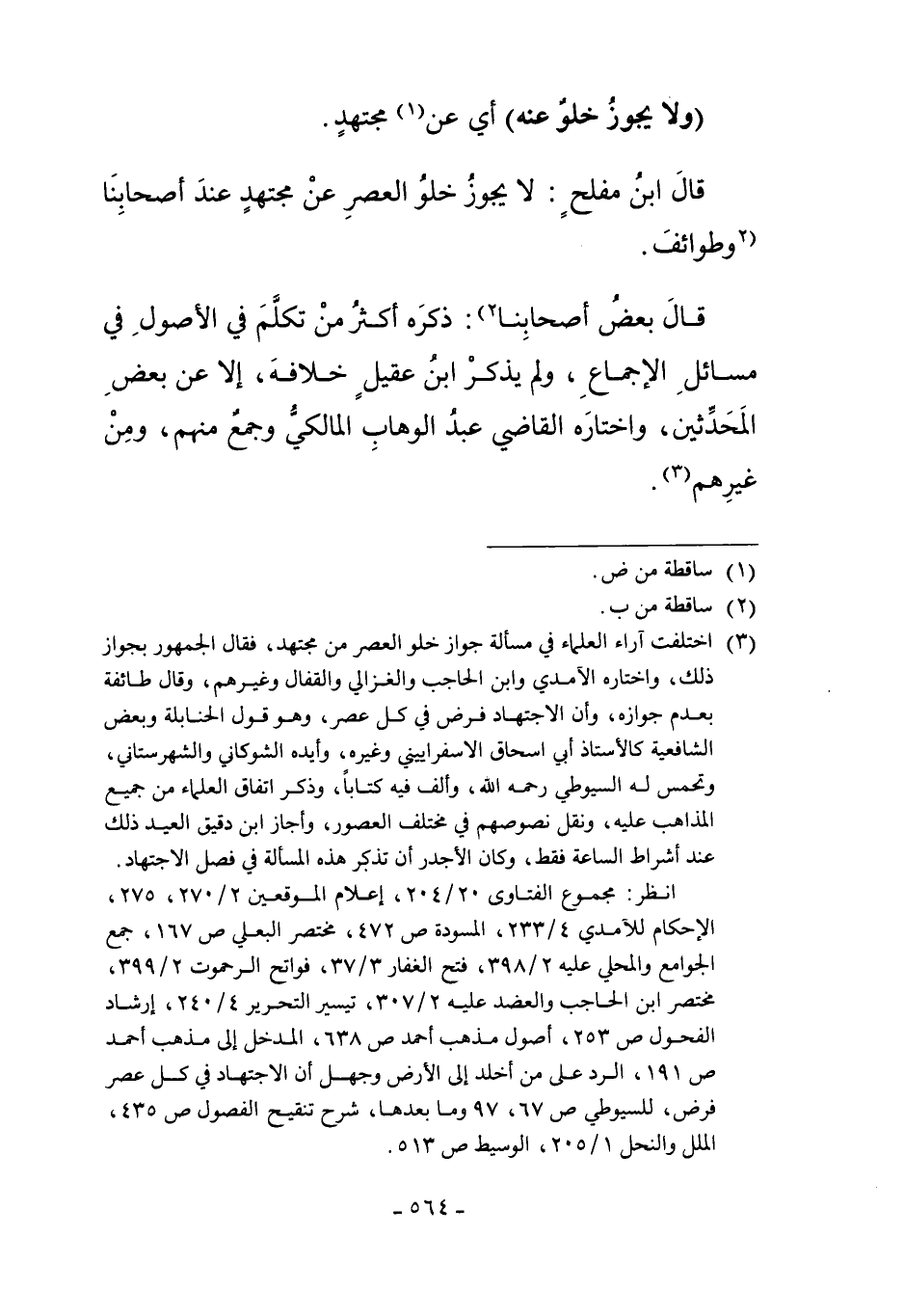 3 اختلفت أراء العلماء في مألة جواز خلو العصر من مجتهدن فقال الجمهور بجواز ذلك، واختاره الآمدي وابن الحاجب والغزالي والقفال وغيرهم، وقال طائفة بعدم جوازه، وأن الاجتهاد فرض في كل عصر، وهو قول الحنابلة وبعض الشافعية كالأستاذ أبي إسحاق الإسفراييني وغيره، وأيده الشوكاني والشهرستاني، وتحمس له السيوطي رحمه الله، وألف فيه كتاباً، وذكر اتفاق العلماء من جميع المذاهب عليه، ونقل نصوصهم في مختلف العصور، وأجاز ابن دقيق العيد ذلك عند أشراط الساعة فقط، وكان الأجدر أن تذكر هذه المسألة في فصل الاجتهاد.