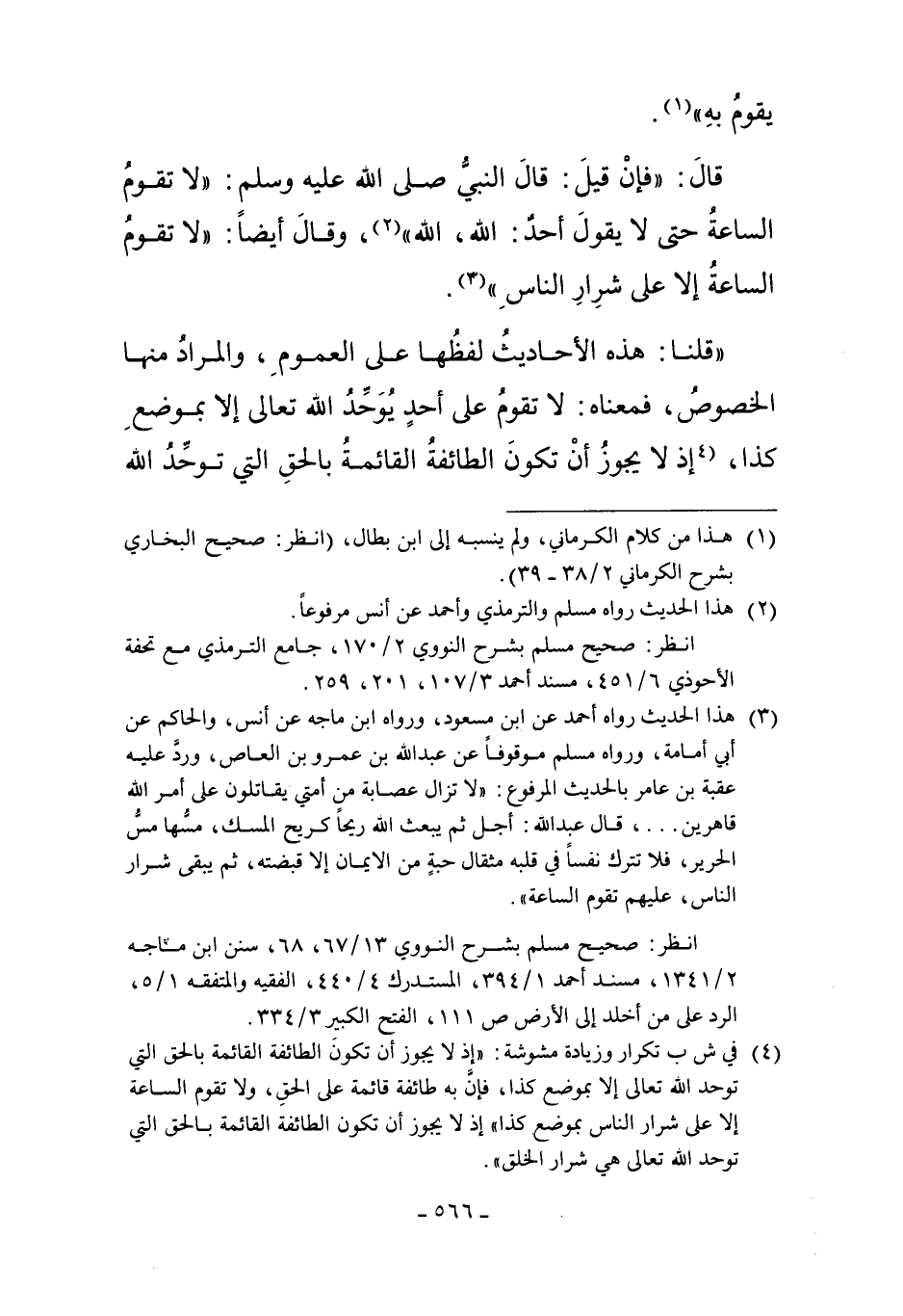 4 في ش ب تكرار وزيادة مشوشة: "إذ لا يجوز أن تكون الطائفة القائمة بالحق التي توحد الله تعالى إلا بموضع كذا، فإن به طائفة قائمة على الحق، ولا تقوم الساعة إلا على شرار الناس بموضع كذا، إذ لا يجوز أن تكون الطائفة القائمة بالحق التي توحد الله تعالى هي شرار الخلق".
