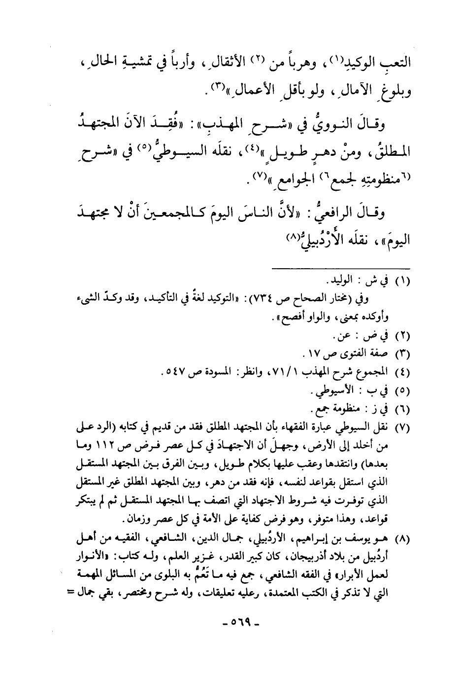 وَقَالَ النَّوَوِيُّ فِي شَرْحِ الْمُهَذَّبِ: فُقِدَ الآنَ الْمُجْتَهِدُ الْمُطْلَقُ، وَمِنْ دَهْرٍ طَوِيلٍ4، نَقَلَهُ السُّيُوطِيّ5 فِي شَرْحِ مَنْظُومَتِهِ لِجَمْعِ6 الْجَوَامِعِ7.