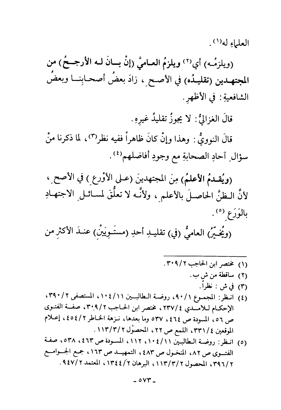 5 انظر: روضة الطالبين 11/104، 112، المسودة ص 463، 538، صفة الفتوى ص 82، المنخول ص 483، التمهيد ص 163، جمع الجوامع 2/396، المحصول 2/3/113، البرهان 2/1344، المعتمد 2/947.