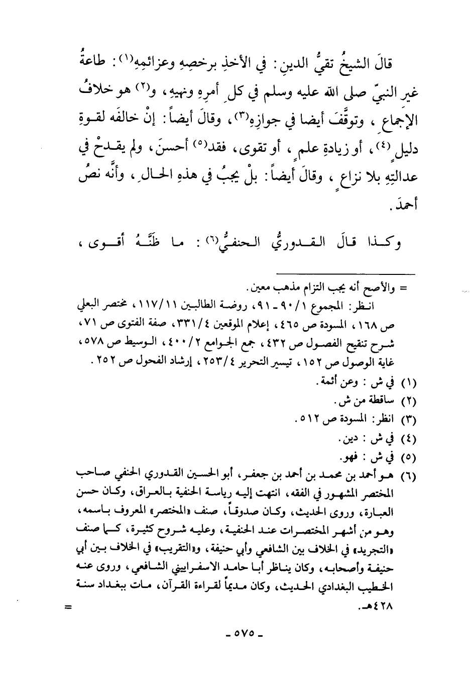 6 هو أحمد بن محمد بن أحمد بن جعفر، أبو الحسين القدوري الحنفي صاحب المختصر المشهور في الفقه، انتهت إليه رياسة الحنفية بالعراق، وكان حسن العبارة، وروى الحديث، وكان صدوقا، صنف "المختصر" المعروف باسمه، وهو من أشهر المختصرات عند الحنفية، وعليه شروح كثيرة، كما صنف "التجريد" في الخلاف بين الشافعي وأبي حنيفة، و"التقريب" في الخلاف بين أبي حنيفة وأصحابه، وكان يناظر أبا حامد الإسفراييني الشافعي، وروى عنه الخطيب البغدادي الحديث، وكان مديماً لقراءة القرآن، مات ببغداد سنة 428هـ. انظر ترجمته "الفوائد البهية ص 30، تج التراجم ص7، وفيات الأعيان 1/60، البداية والنهاية 12/24، الأعلام 1/206، مفتاح السعادة 2/280"